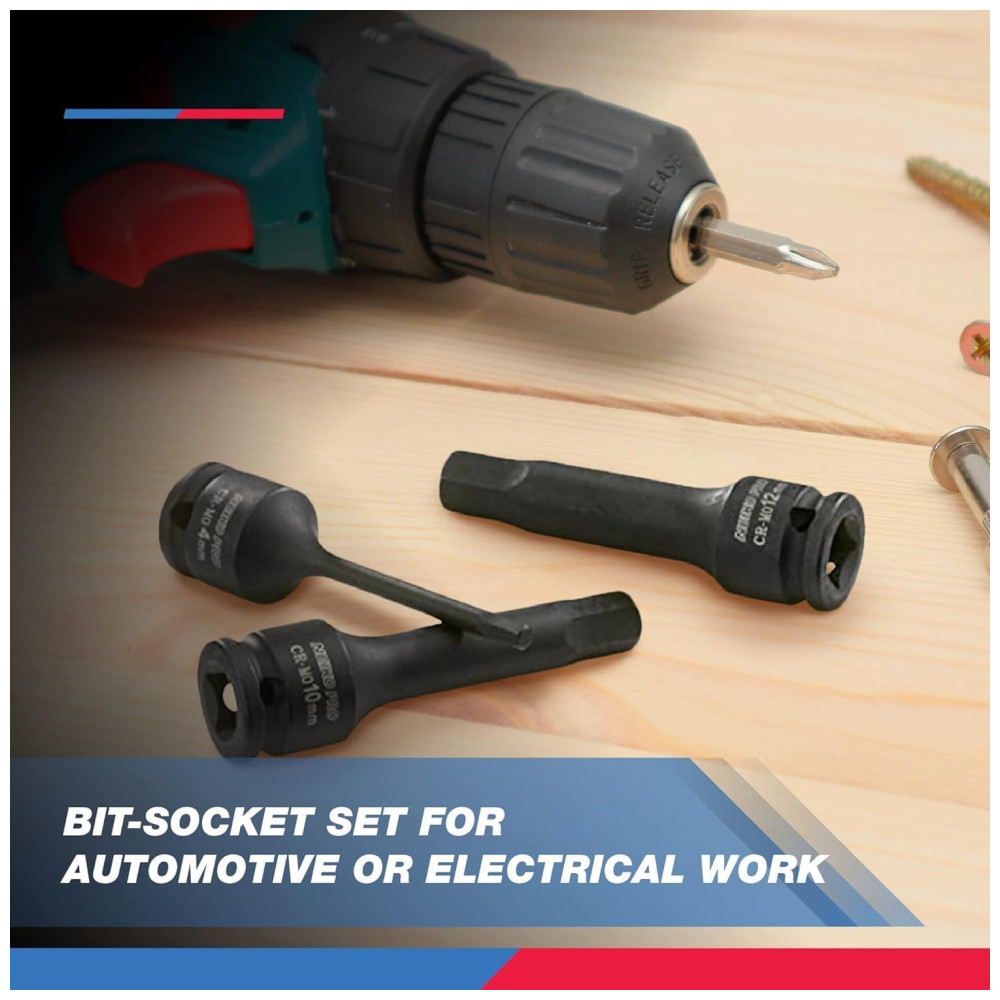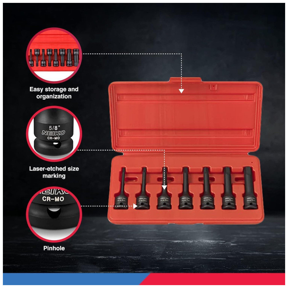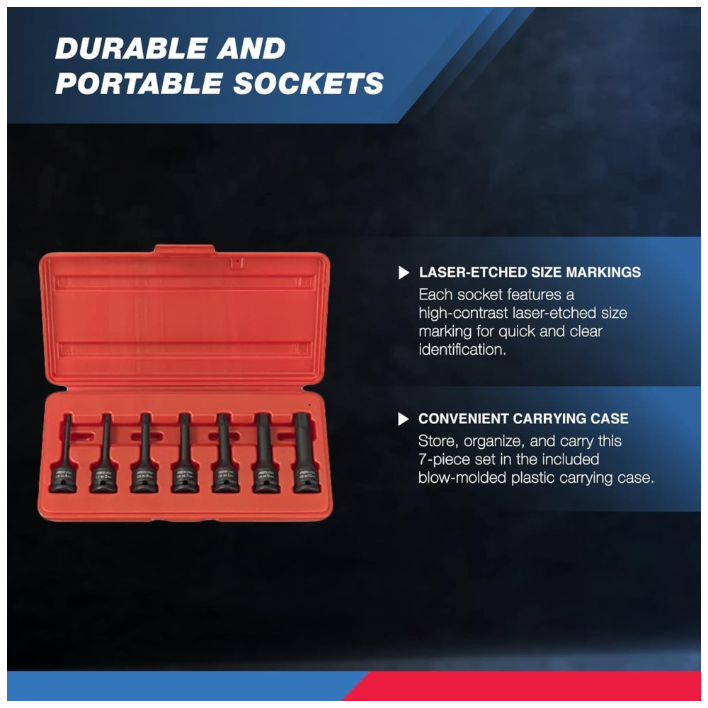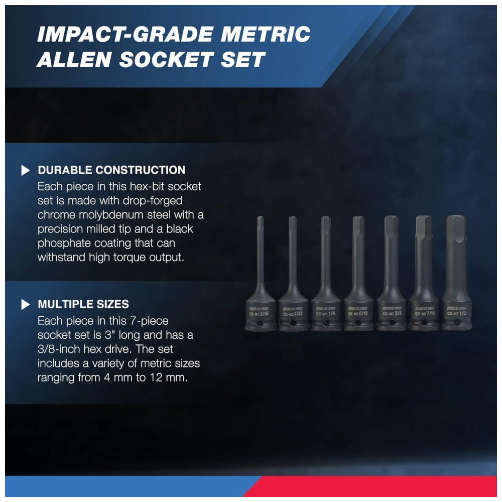 QUALIDADE PRO Conjunto completo de chaves Allen hexagonais métricas de 3, 8 de 7,6cm de comprimento para afrouxar e apertar parafusos e porcas resistentes GAMA LARGA DE TAMANHOS Um espectro completo de soquetes métricos de soquetes de driver hexagonal, incluindo 4, 5, 6, 7, 8, 10, CONSTRUÇÃO PESADA Feita de aço cromo vanádio forjado para maior resistência e durabilidade EXTRA LONGO Perfeito para mecânicos e eletricistas, o comprimento de três polegadas atinge lugares onde os soquetes de impacto de tamanho regular não IMPACTO PRONTO Os soquetes de 3, 8 estão prontos para impacto e oferecem alta resistência e torque. A construção de aço molibdênio de alta resistência e as pontas fresadas com precisão proporcionam desempenho premium com um ajuste exato na cabeça do fixador. Essas ferramentas foram projetadas para serem usadas com drivers de impacto para liberar parafusos enferrujados e apertados demais. O conjunto inclui Unidade de 3, 8 de polegada de 7 soquetes de impacto de driver hexagonal métrico 4, 5, 6, 7, 8, 10, . Estojo de zenamento e transporte incluído