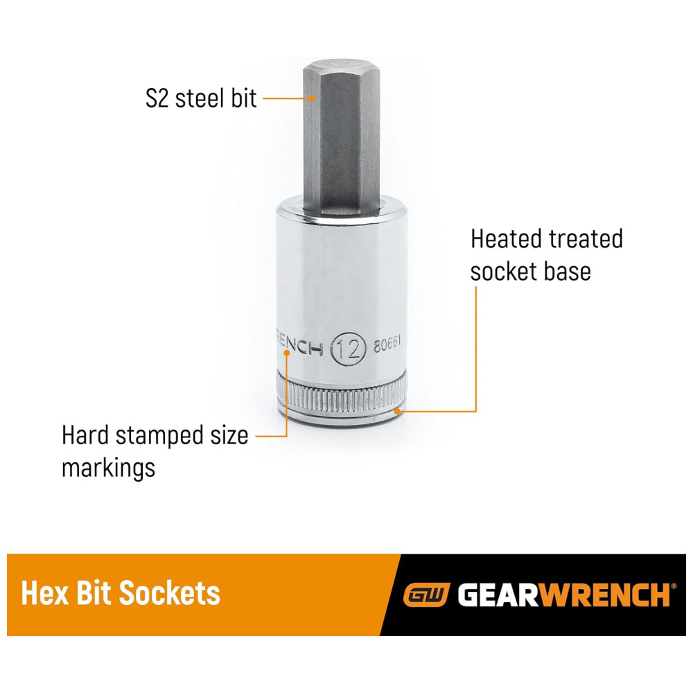 Ferramenta Automotiva Chave de Engrenagem 12 Peças Soquetes Métricos de Bit Hexagonal GEARWRENCH 80580 Prateado