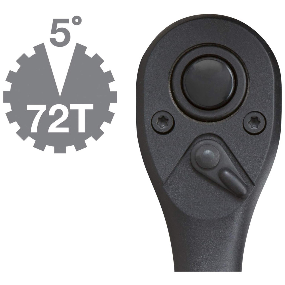 A catraca oval de 72 dentes precisa apenas de um arco oscilante de 5 graus. A trava de acionamento de liberação rápida, botão de pressão, evita soquetes caídos. Cabeça da catraca e núcleo da manivela de aço cromo vanádio forjado e tratado termicamente. Núcleo da alça confortável em temperaturas baixas e evita arranhões ou estragos nas peças acabadas. A alça deslocada permite aos dedos uma folga extra. Para uma catraca que não congela sua mão em clima frio e não arranha acabamentos finos, escolha a TEKTON 1, 2 pol. Catraca composta de acionamento. No seu núcleo está uma alça e cabeça de aço cromo vanádio resistente, endurecidas e reforçadas através de um processo preciso de tratamento térmico. O invólucro poli de alto impacto é mais macio que as peças metálicas, portanto é usá lo próximo a superfícies cromadas, alumínio e pintadas. Excelente em espaços reduzidos, a catraca oval de 72 dentes precisa apenas de um arco de giro de 5 graus. As patas duplas grandes aderem sem escorregar, proporcionando mais torque. A direção do acionamento é facilmente alterada com a chave reversa acionada por polegar. Os soquetes travam na espiga da unidade de liberação rápida, para que você não precise se preocupar em soltá los. A alça de deslocamento fornece folga extra dos dedos, evitando articulações arranhadas. A catraca atende ou excede os padrões dimensionais e de desempenho ANSI
