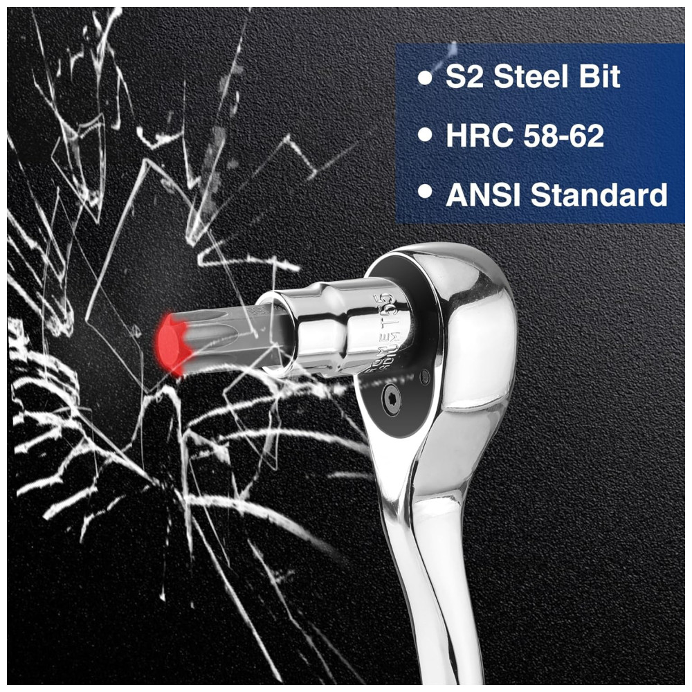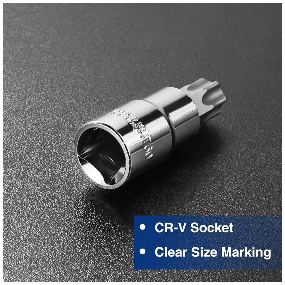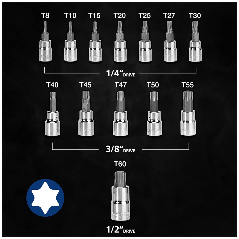 Broca de aço S2 forjada a quente e tratada termicamente para torque, força e durabilidade. Os soquetes de vanádio cromado fornecem máxima resistência ao óleo e à corrosão. Atendem e excedem todas as especificações ANSI para maior segurança. Trabalho em carros, caminhões, eletrodomésticos, equipamentos para gramados, máquinas e outros trabalhos que exigem fixadores , parafusos , soquetes elétricos. Conjunto inclui soquetes Dr. Bit de 7pc 1, 4 T8, T10, T15, T20, T25, T27, 0 5pc 3, 8 Dr. Soquetes de bits T40, T45, T47, T50, T55 e 1pc1 , 2 Dr Soquetes de bits T60