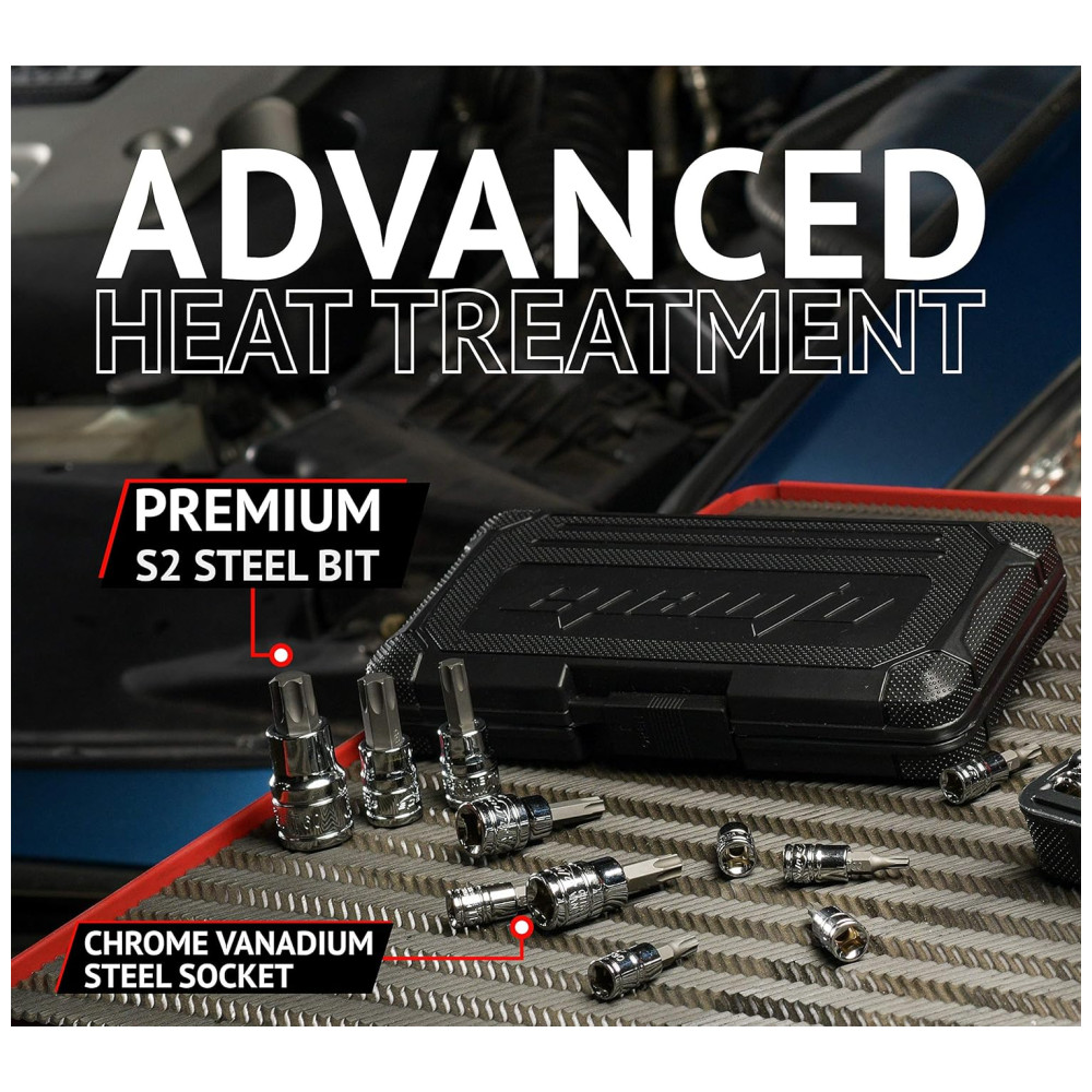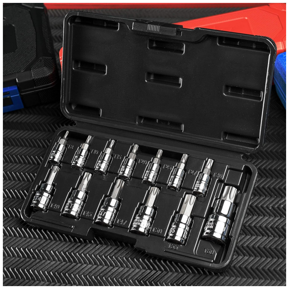 Durabilidade Feito de aço de liga de cromo vanádio tratado endurecido Cr V resistente à corrosão cromado e polido a espelho fácil zenamento inclui um estojo de plástico resistente. Conteúdo do conjunto de soquetes de bit Torx Unidade de 1, 4 T8, T10, T15, T20, T25, T27, 0 Unidade de 3, 8 T40, T45, T47, T50, T55 Unidade de 1, 2 T60
