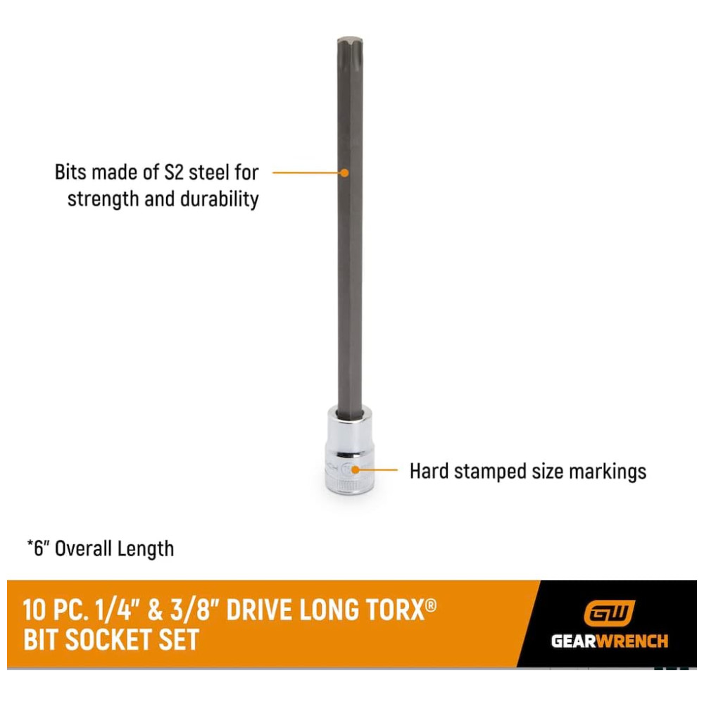 Soquetes de precisão moldados a frio para dimensão exata e maior resistência Acabamento em níquel cromo para resistência à corrosão Acabamento em óxido preto para longa vida útil. As ferramentas off road da Drake incluem 1, 4 dr. Soquete de bit torx longo, t 8 kdt 82510 1, 4 dr. Soquete de bit torx longo, t 10 kdt 82511 1, 4 dr. Soquete de bit torx longo, t 15 kdt 82512 1, 4 dr. Soquete de bit torx longo, t 20 kdt 82513 1, 4 dr. Soquete de bit torx longo, t 25 kdt 82514 1, 4 dr. Soquete longo bit torx, t 27 kdt 82515 1, 4 dr. Soquete longo bit torx, t 30 kdt 82516 3, 8 dr. Soquete longo bit torx, t 40 kdt 82517 3, 8 dr. Soquete longo bit torx, t 45 kdt 82518 3, 8 dr. Soquete de bit torx longo, t 50 kdt 82519. Chave de engrenagem 80588 Conjunto de soquetes torx longos de 10 peças composto por 82510 T8, 82511 T10, 82512 T15, 82513 T20, 82514 T25, 82515 T27, 82516 0, 82517 T40, 82518 T45 e 82519 T50 soquete de bit longo torx 1 , 4 Unidade em polegadas. Soquetes de precisão formados a frio para dimensões exatas consistentes e maior resistência. O acabamento em níquel cromo dos soquetes fornece uma vida útil de resistência à corrosão. O ajuste Torx é feito de aço carbono aquecido forjado com tolerâncias exatas com acabamento em óxido preto para maior durabilidade. O comprimento de 15cm permite fácil acesso a locais de difícil acesso
