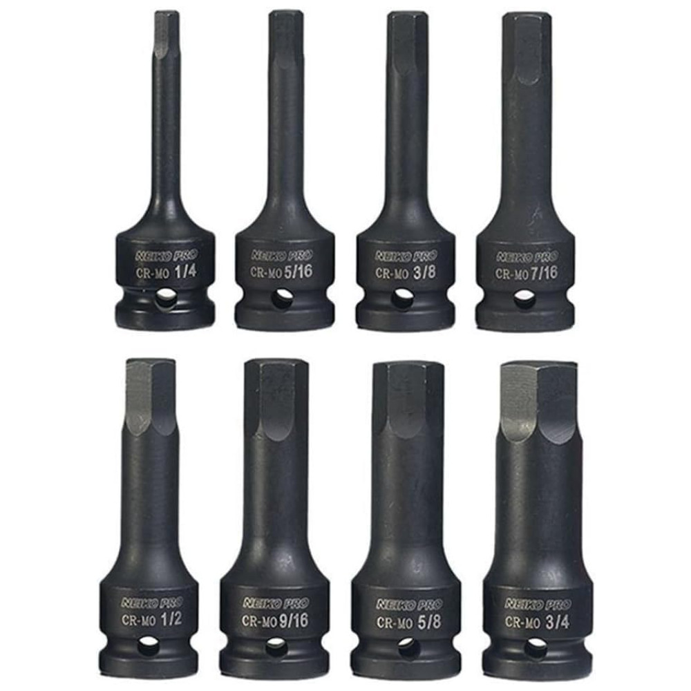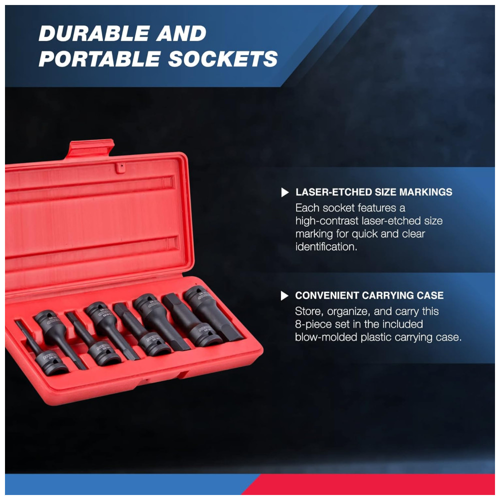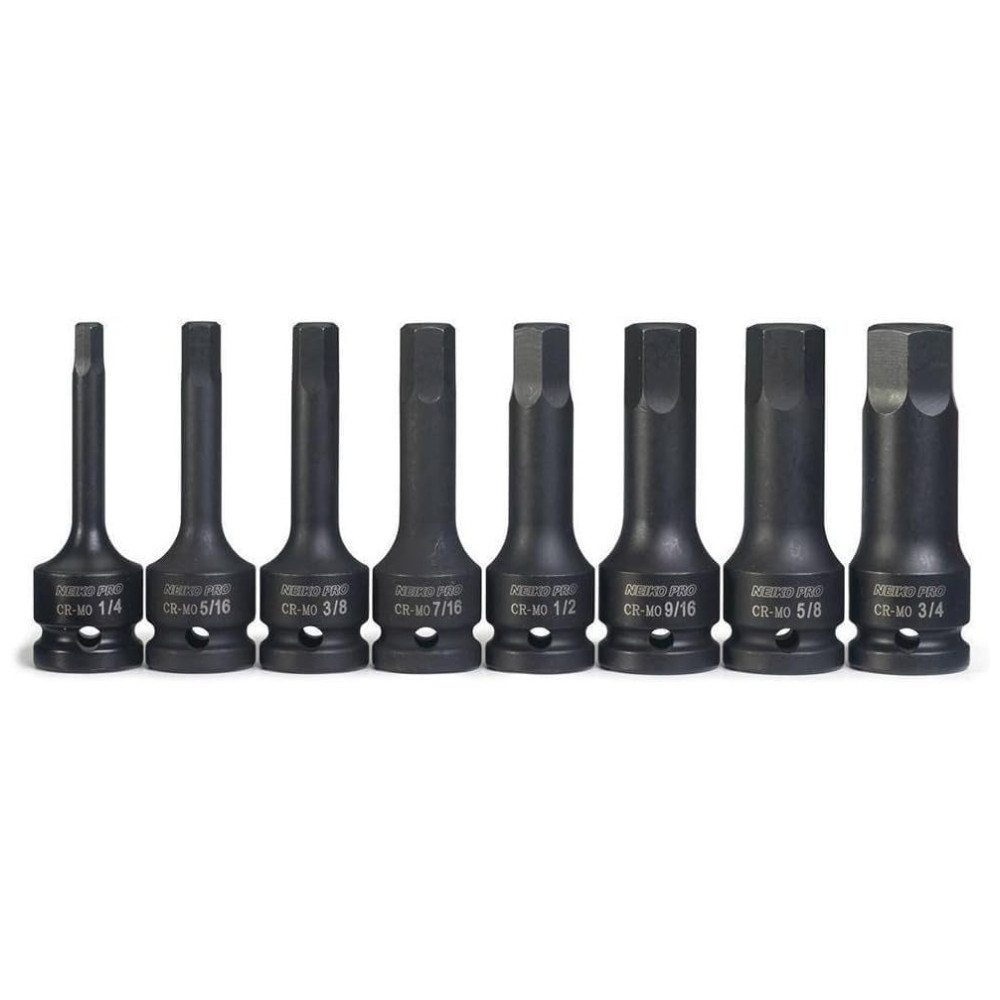 UM CONJUNTO COMPLETO Um conjunto completo de soquetes resistentes SAE Allen e de ponta hexagonal para construção e uso automotivo RESISTENTE Feito de aço cromo moly de alta qualidade com acabamento fosfato preto que resiste à corrosão RETENÇÃO SEGURA soquetes projetados com um pino furo para uso com sistemas de pinos e O ring para retenção segura de soquetes TAMANHOS COMUNS Inclui soquetes padrão 1, 4, 5, 16, 3, 8, 7, 16, 1, 2, 9, 16, 5, 8, 3 , 4 pol. CASO DE ORGANIZAÇÃO O conjunto inclui um estojo de zenamento de plástico rígido. A construção de aço molibdênio de alta resistência e as pontas fresadas com precisão proporcionam desempenho premium com um ajuste exato na cabeça do fixador. Essas ferramentas foram projetadas para serem usadas com drivers de impacto para liberar parafusos enferrujados e apertados demais. O conjunto inclui Soquetes de impacto de driver hexagonal SAE de unidade de 1, 2 pol. De 8 peças 1, 4, 5, 16, 3, 8, 7, 16, 1, 2, 9, 16, 5, 8, 3 , 4 polegadas. Estojo de zenamento e transporte incluído