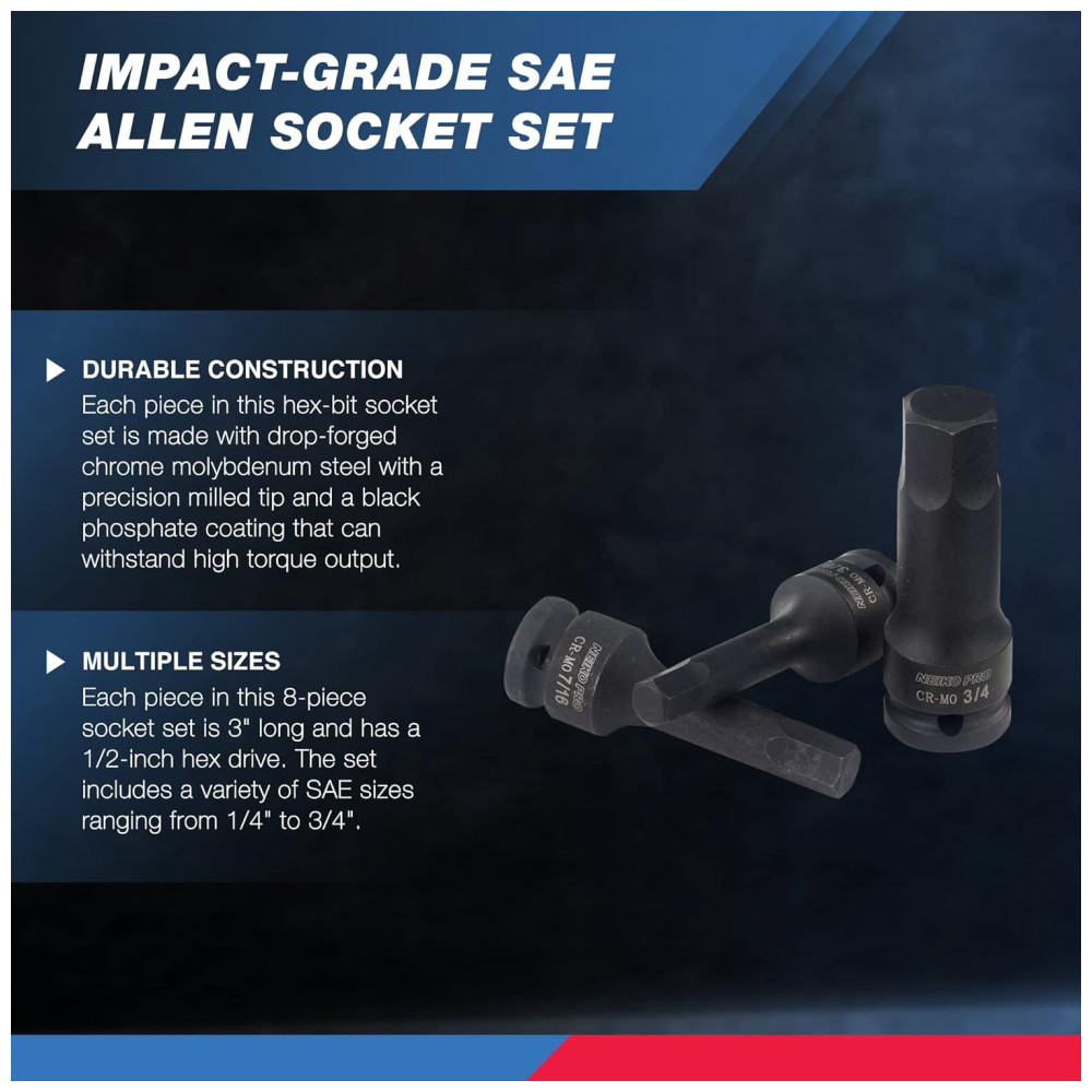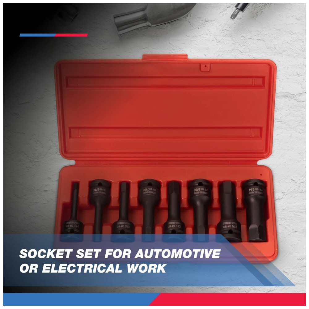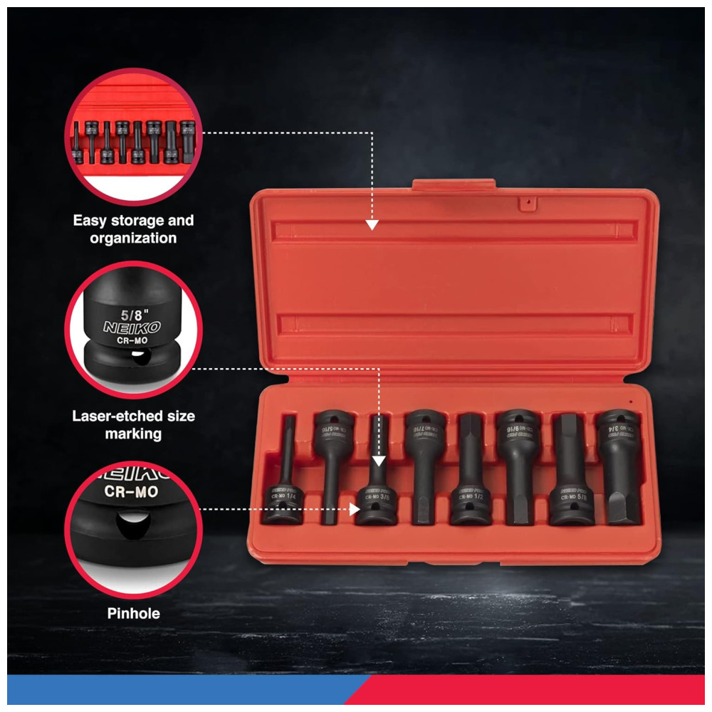 Ferramenta Automotiva Conjunto Soquetes Allen 1 2 Hexagonal SAE a 8 Peças Cr Mo NEIKO 01137B Vermelho