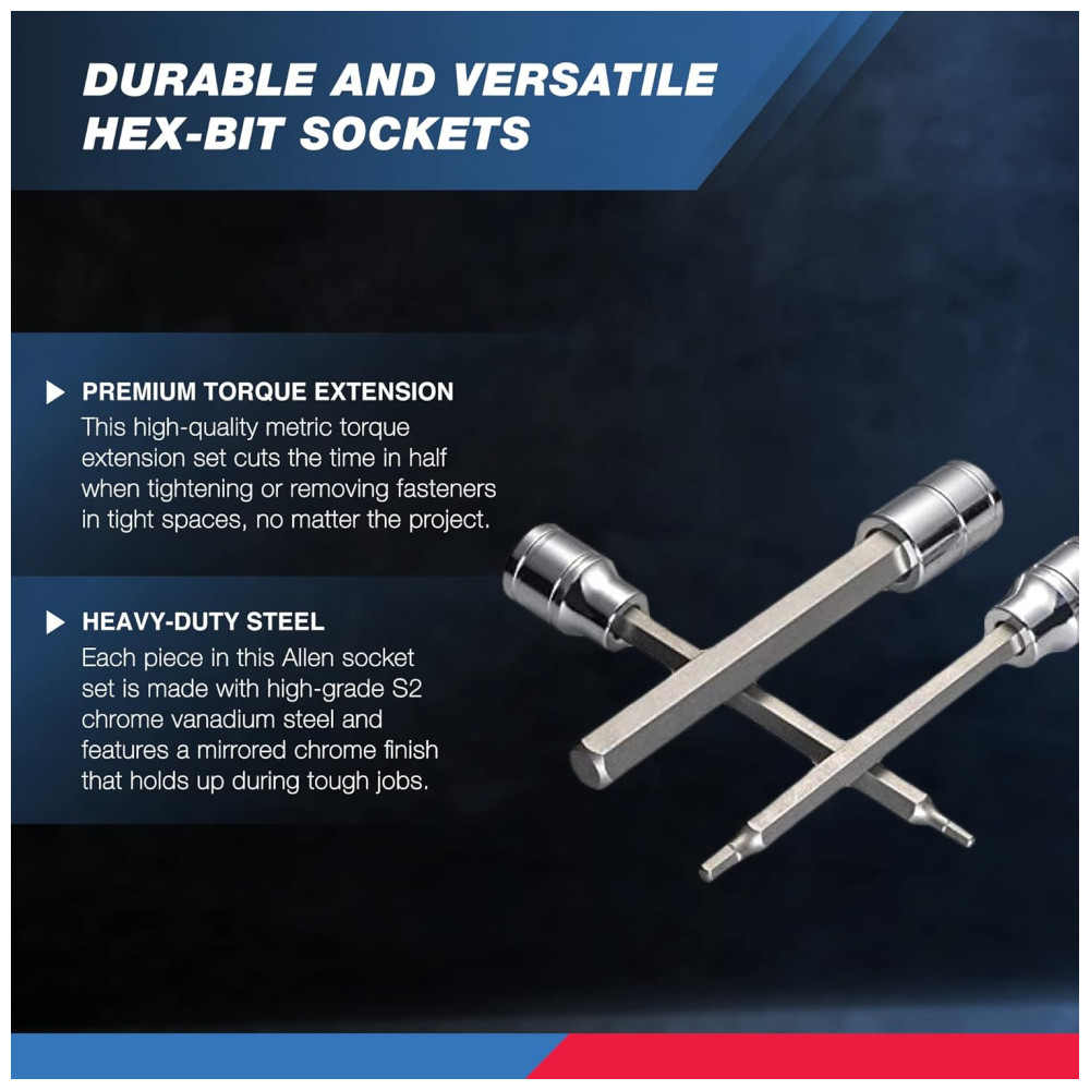 APLICAÇÕES AUTOMOTIVAS Um conjunto de extensão de torque métrico de alta qualidade que reduz o tempo pela metade ao remover porcas sextavadas difíceis de alcançar e corroídas AÇO DE ALTA QUALIDADE Combinação de brocas de aço S2 de alta qualidade e soquetes de aço de liga de cromo vanádio com cromo polido no espelho, placa que retém trabalho após trabalho Inclui conjunto extra longo x 3, 4, 5, 6, 7, 8 e de soquetes para acessar espaços apertados, como suspensões de automóveis na Europa ALTAMENTE VISÍVEL Os soquetes sextavados apresentam marcações gravadas a laser para uma seleção de bits mais fácil e rápida. Vem com um estojo de transporte conveniente. As brocas de aço S2 premium oferecem resistência e durabilidade ideais para desaparafusar os parafusos intratáveis e as pontas das brocas são dimensionadas para um encaixe preciso. Os soquetes são feitos de cromo vanádio duradouro. Nosso conjunto métrico inclui soquetes de bit sextavado com unidade de 3, 8 de polegada e 7 peças , T4, T5, T6, T7, T8 e T10. Conjunto de extensão de torque de qualidade, fabricado em aço liga Cr V, polido a espelho e cromado, forjado a gota e tratado termicamente em aço. Perfeito para mecânica de automóveis e para outras aplicações
