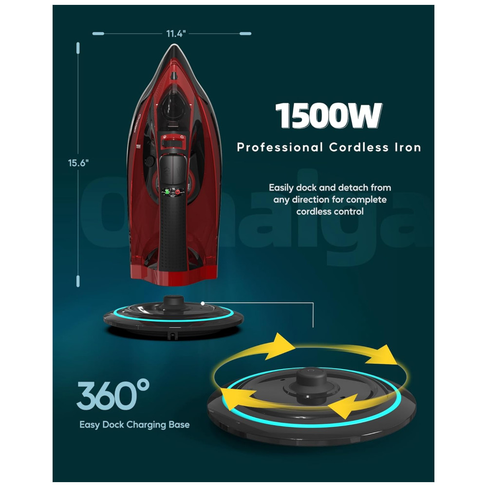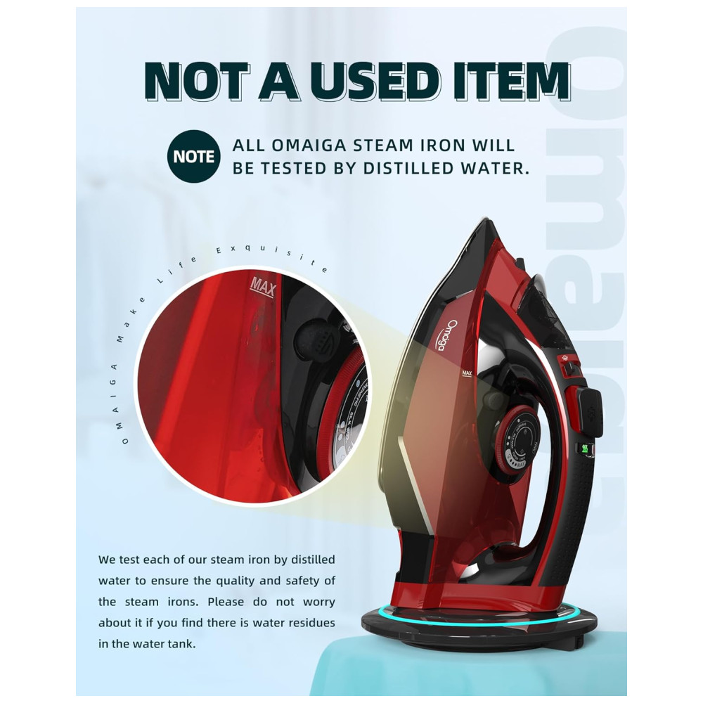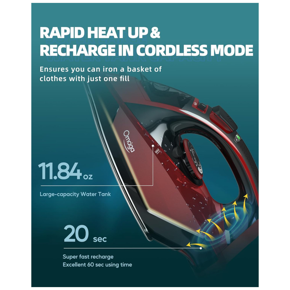 ATUALIZAR O DESIGN OMAIGA O ferro sem fio carrega até o calor total em apenas 30 segundos e reaquece rapidamente em apenas 25 segundos quando colocado de volta em sua base. O ferro a vapor profissional você pode usar com mais facilidade e rapidez sem as limitações de fios torcidos, fios conosco ou ficar preso na tábua de passar. Uma poderosa explosão de vapor fornece uma explosão extra de vapor, permitindo que você remova rugas com rapidez e facilidade.