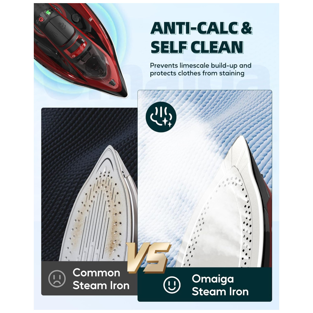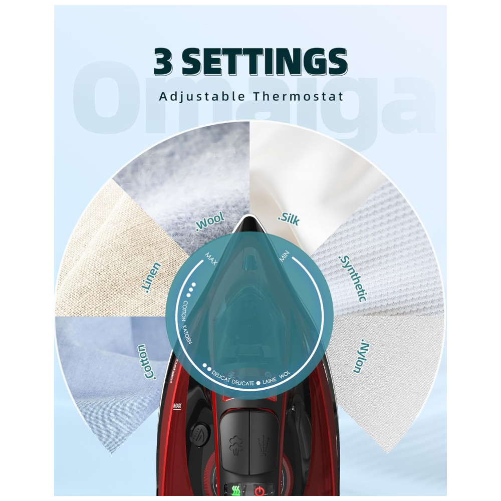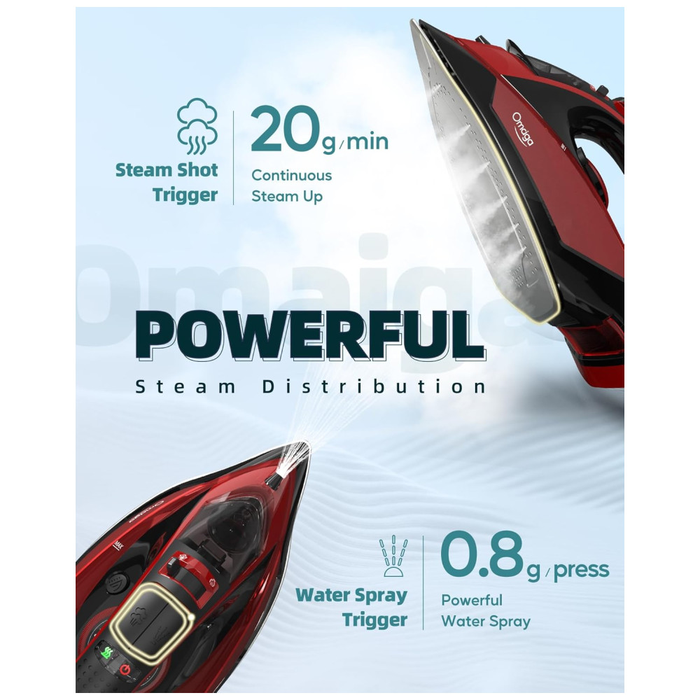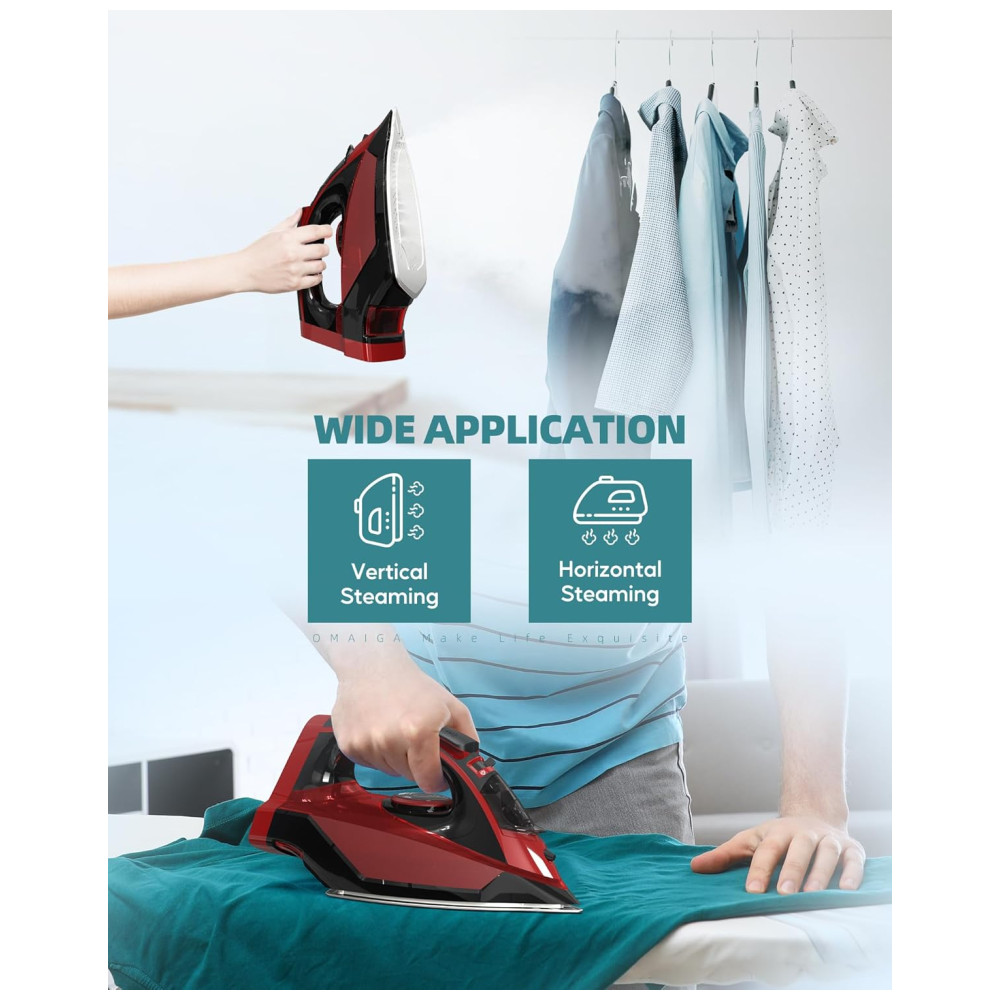 ATUALIZAR O DESIGN OMAIGA O ferro sem fio carrega até o calor total em apenas 30 segundos e reaquece rapidamente em apenas 25 segundos quando colocado de volta em sua base. O ferro a vapor profissional você pode usar com mais facilidade e rapidez sem as limitações de fios torcidos, fios conosco ou ficar preso na tábua de passar. Uma poderosa explosão de vapor fornece uma explosão extra de vapor, permitindo que você remova rugas com rapidez e facilidade.