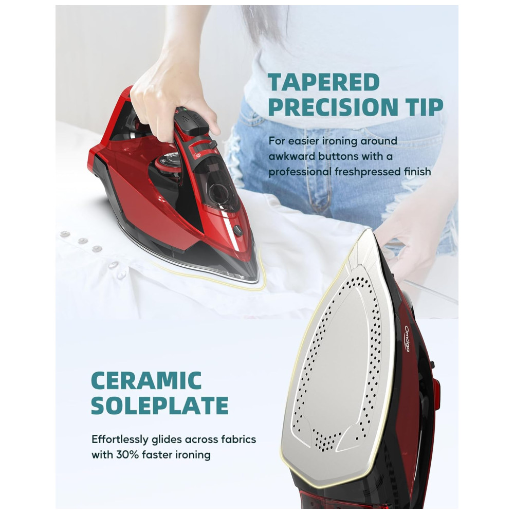RÁPIDO E EFICIENTE A base de cerâmica deste ferro a vapor equipa uma tecnologia avançada que pode fornecer uniformidade e vapor para remover rapidamente as rugas da roupa, e a função de vapor vertical do ferro sem fio não é apenas adequada para engomar horizontal, também para engomar roupas penduradas verticalmente. A base do nosso ferro sem fio é projetada com uma ponta cônica para engomar multidirecional, uso em golas de camisas ou nos espaços estreitos entre os botões com extrema precisão.