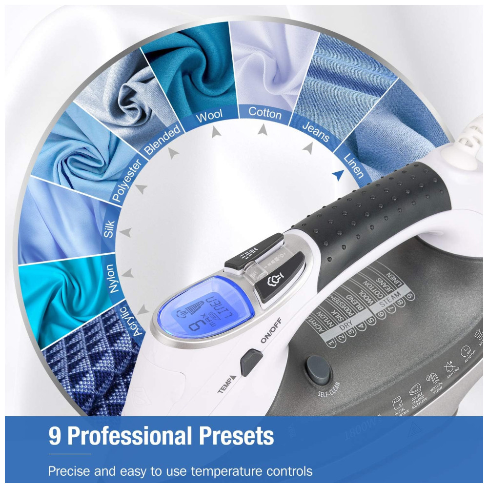 9 modos predefinidos apresenta uma tela LCD de visão clara, pare com adivinhações e não queime suas roupas Selecione o tipo de tecido e passe sempre com o calor adequado Temps ideais para náilon, seda, lã, algodão, jeans, linho e muito mais