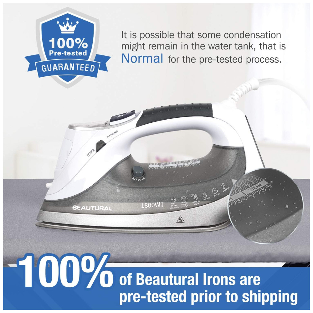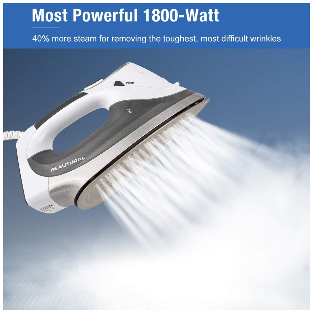 Totalmente caracterizado contém uma enorme lista de recursos, incluindo uma tela LCD, predefinições de tecido, borrifos de água e rajadas de vapor e 1800 watts de potência pura, para que nenhum tecido em sua casa seja muito difícil de passar