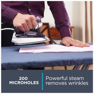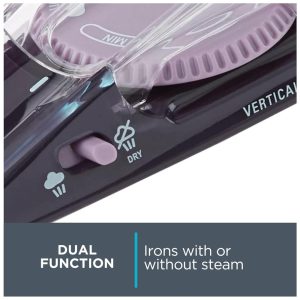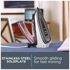 Ferro de primeira classe também oferece jatos de vapor, bem como vapor vertical e variável, controle liga , desliga de vapor que permite engomar com ou sem vapor e um termostato de gama completa.