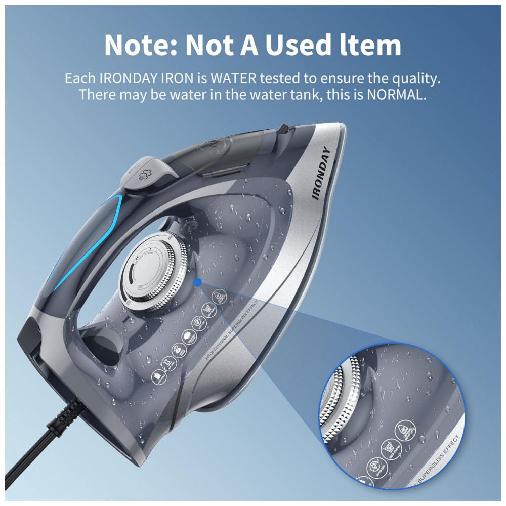 Cada ferro a vapor da IRONDAY é testado com água antes de sair da fábrica para garantir qualidade e segurança. Aquecimento rápido em 20 segundos com potência de 1700W. Ajuste a temperatura de acordo com o tecido desejado. Possui desligamento automático em 3 posições. Com jato de vapor potente, função de spray e autolimpeza anticalcário. Adequado para todos os tipos de tecidos. Garanta roupas impecáveis sem esforço com este ferro eficiente e prático!