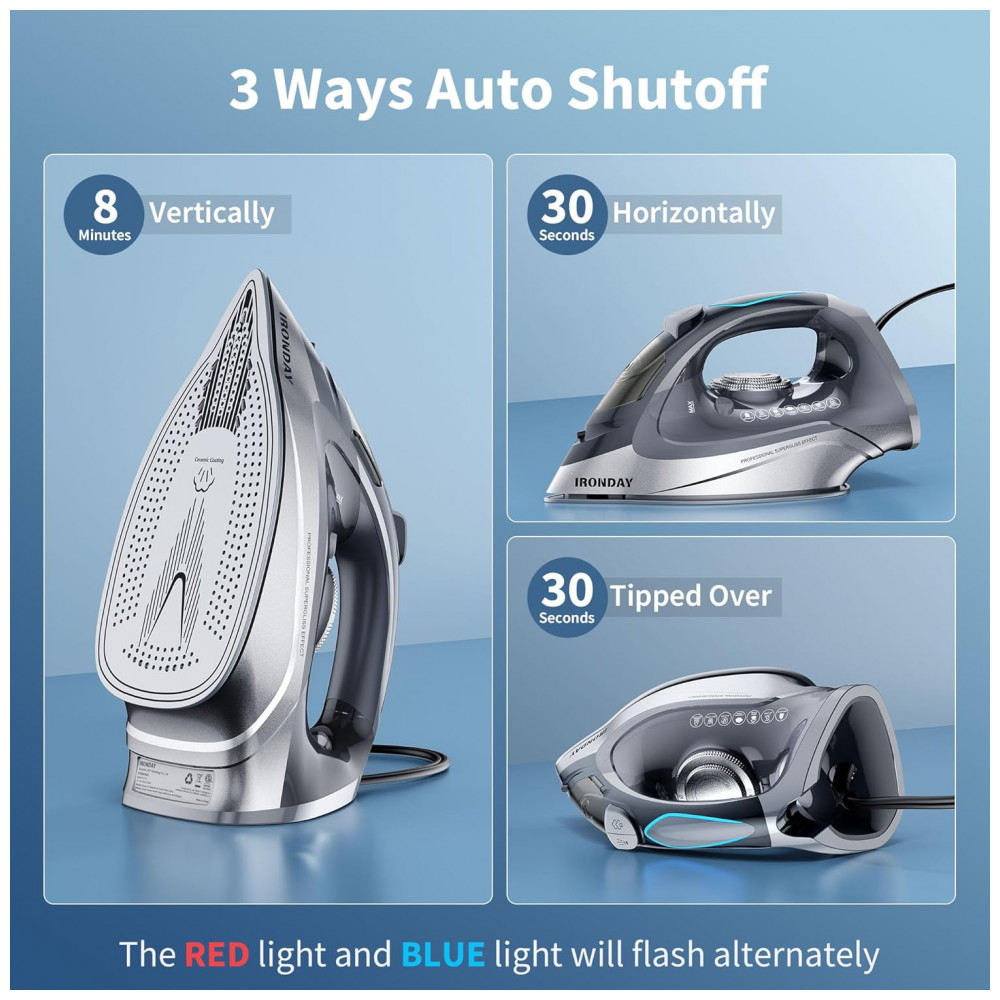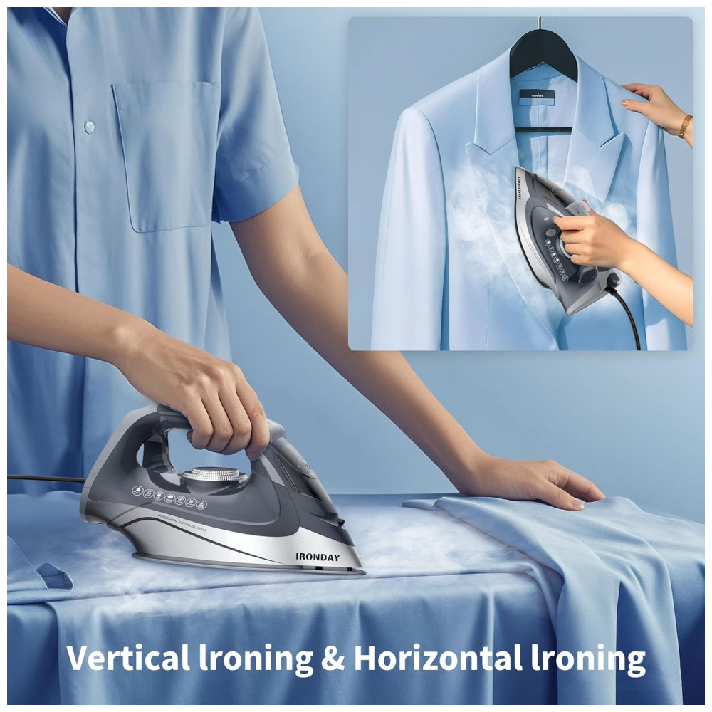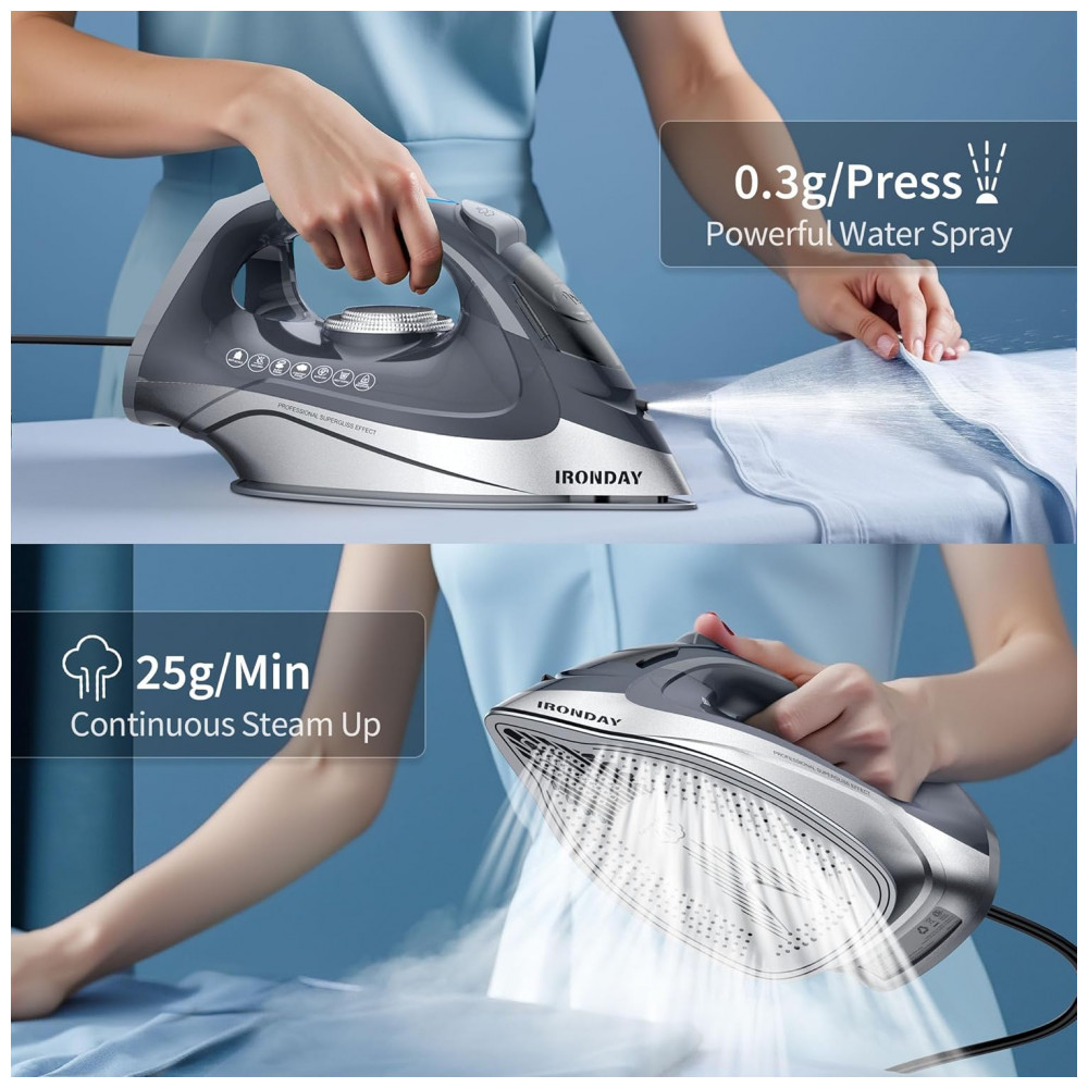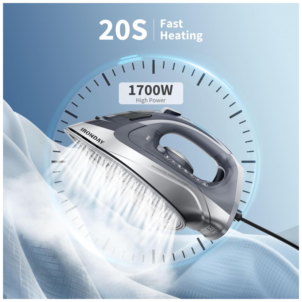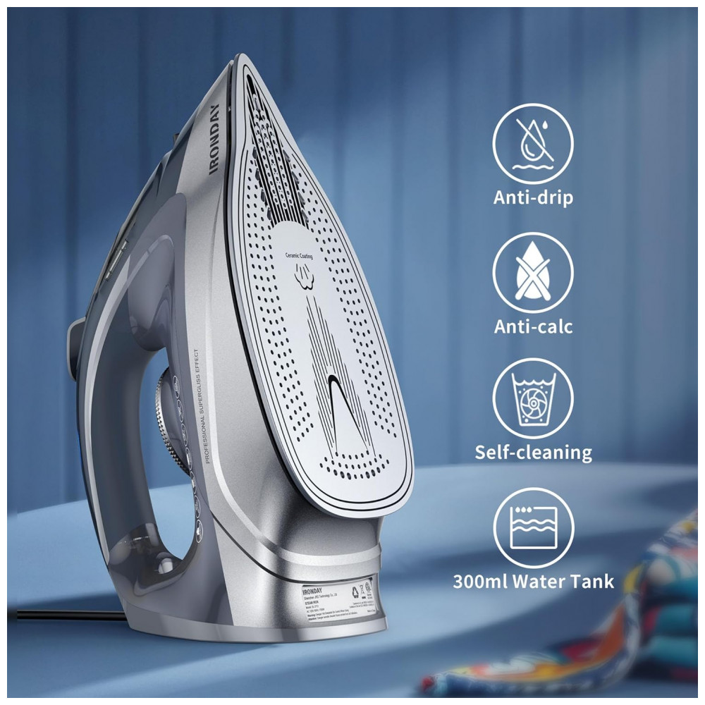 Ferro de Passar a Vapor IRONDAY 1700W – Aquecimento Rápido Autodesligamento Antigotejamento Autolimpeza Reservatório de 300ml Base Cerâmica