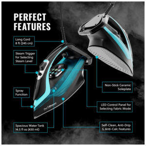 TECNOLOGIA DIGITAL DE PONTA: O Ferro de Passar a Vapor PurSteam SteamTech Elite possui um avançado controle de temperatura digital com display LED, permitindo a seleção precisa do tecido para resultados otimizados a cada uso. DESEMPENHO DE VAPOR PODEROSO: Com 1750W de potência, taxa de vapor de 30g/min e função de jato de vapor, remove rugas profundas com facilidade, sendo perfeito para tecidos pesados e vincos teimosos. PASSADORIA DURADOURA: Desfrute de até 30 minutos de vapor contínuo com o tanque extra grande de 450ml, reduzindo as recargas e sendo ideal para grandes quantidades de roupas. BASE DE CERÂMICA DESLIZANTE: A base de cerâmica premium com revestimento antiaderente desliza suavemente sobre qualquer tecido, garantindo um acabamento polido e sem rugas. SEGURANÇA E DURABILIDADE APRIMORADAS: Equipado com autolimpeza, anticalcário, antigotejamento e desligamento automático, este ferro proporciona passar roupas seguro, livre de sujeira e com desempenho duradouro.