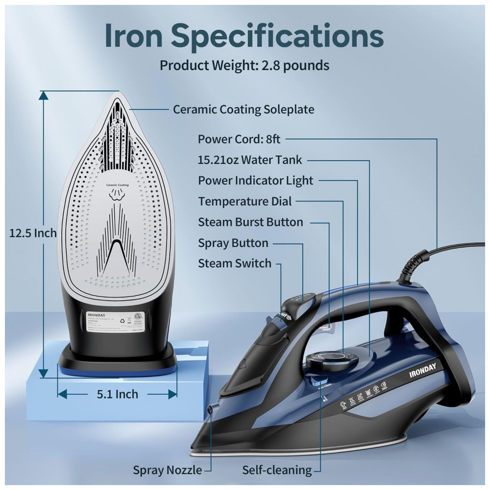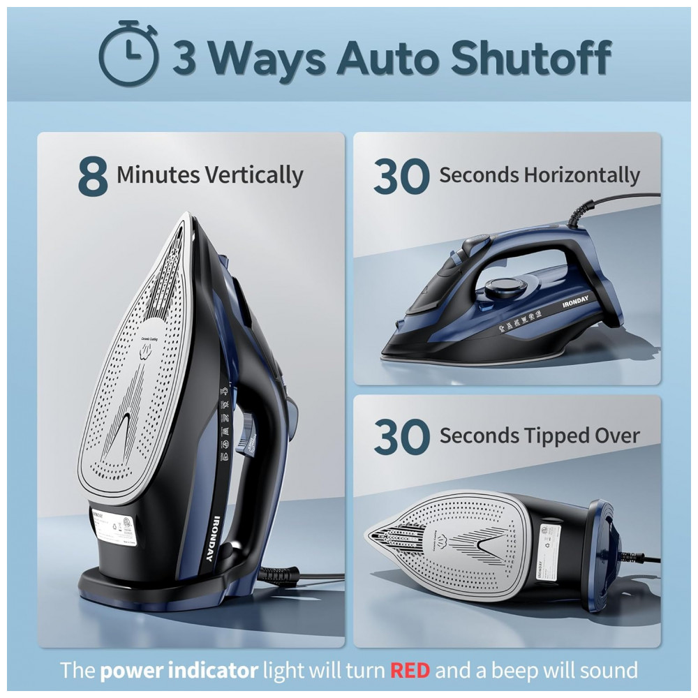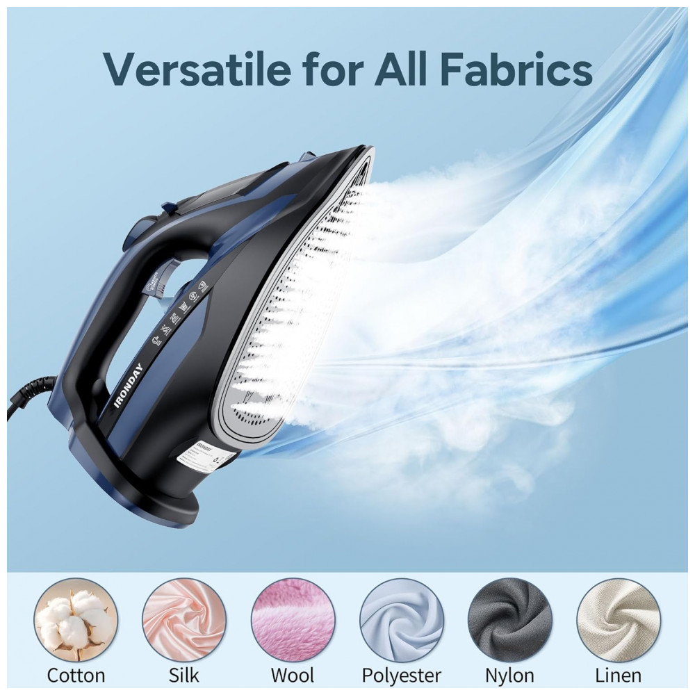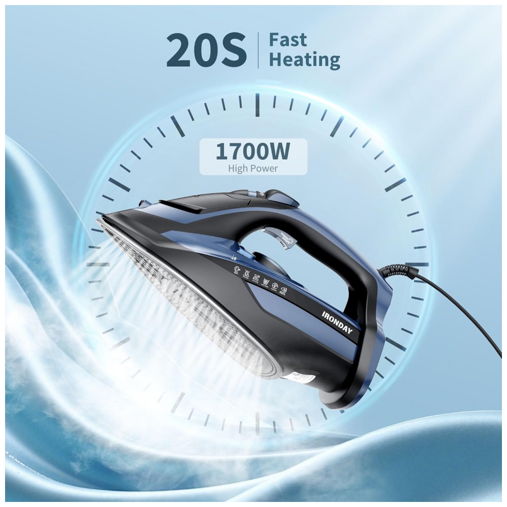 Ferro de Passar a Vapor Rápido Ironday 1700W com Controle de Temperatura Base de Cerâmica Desligamento Automático Jato de Vapor Autolimpeza
