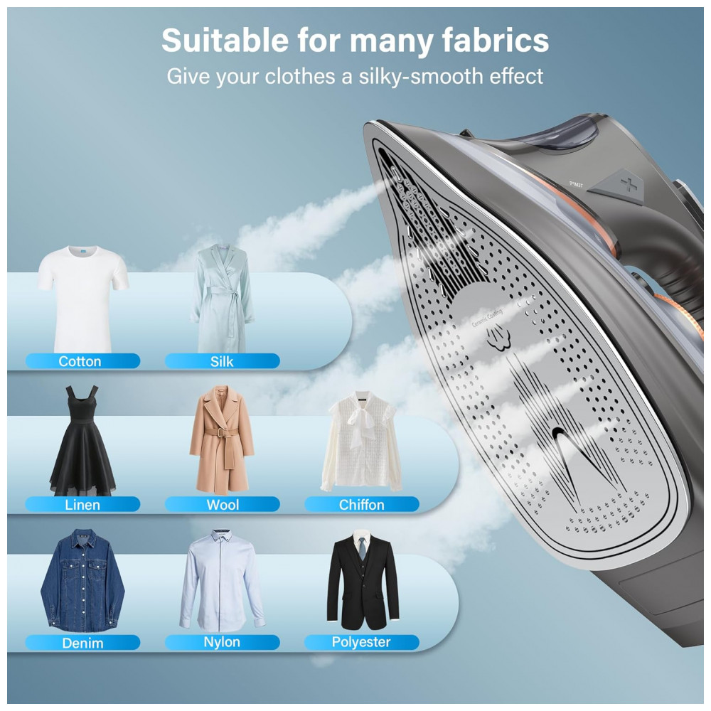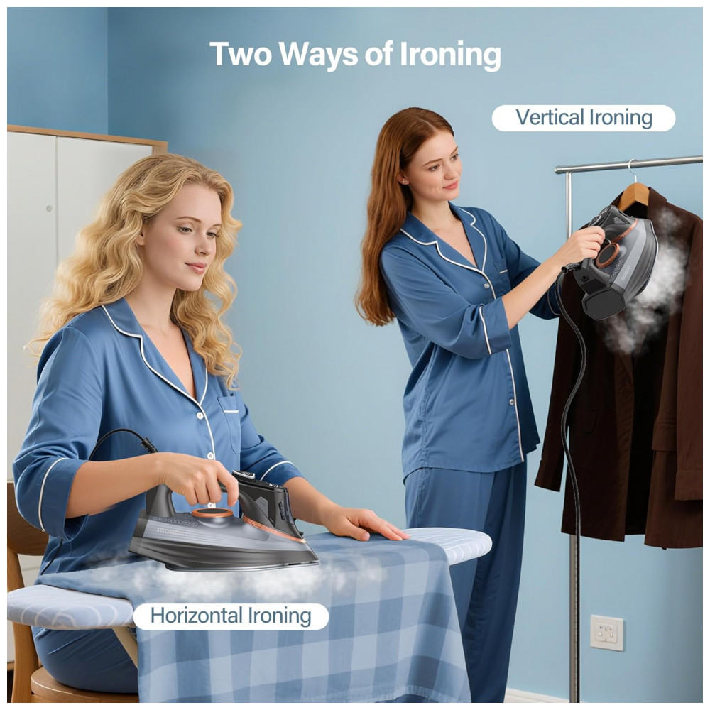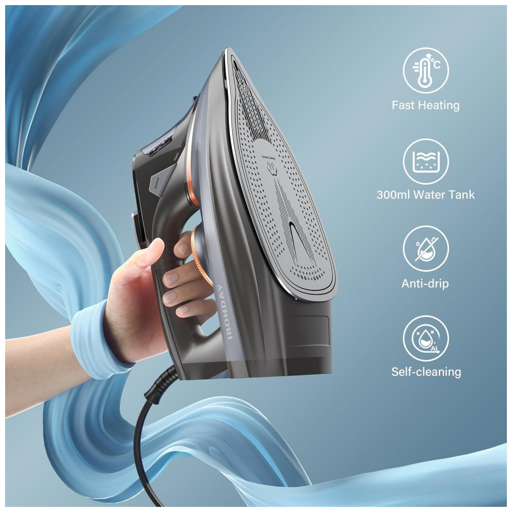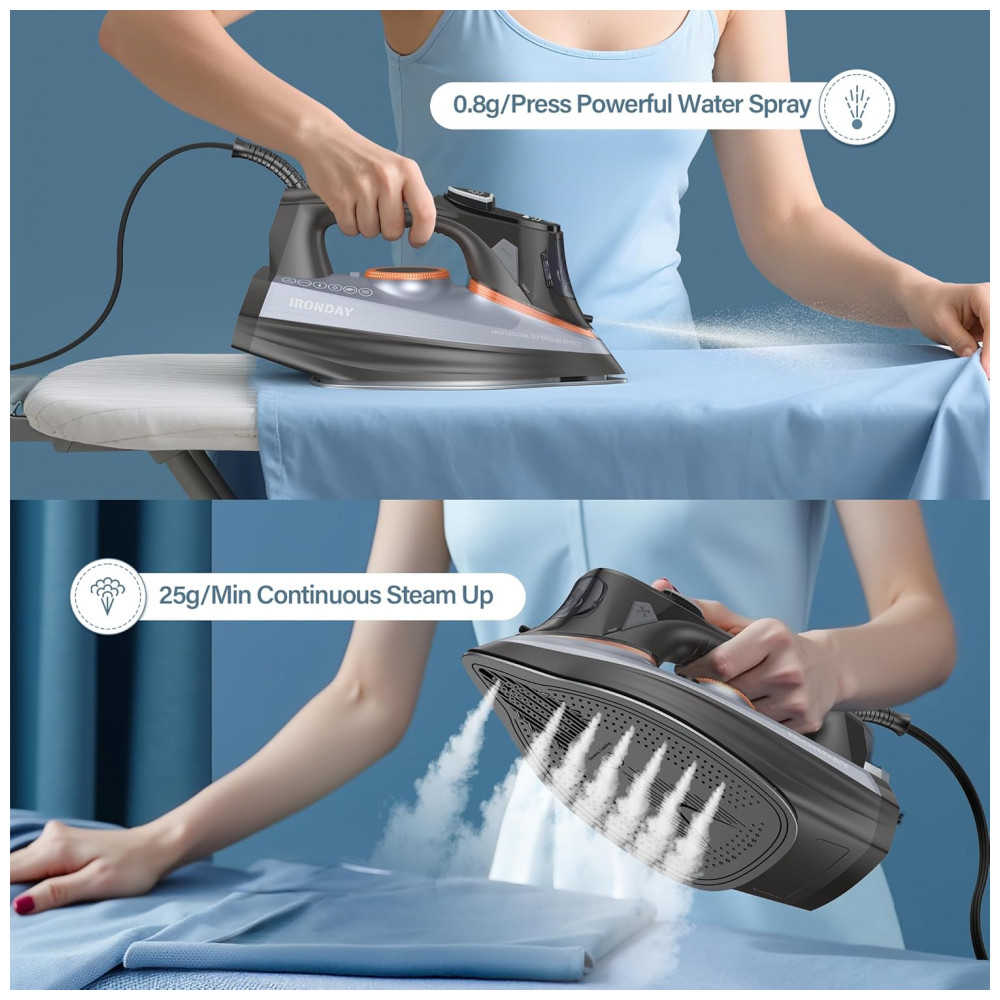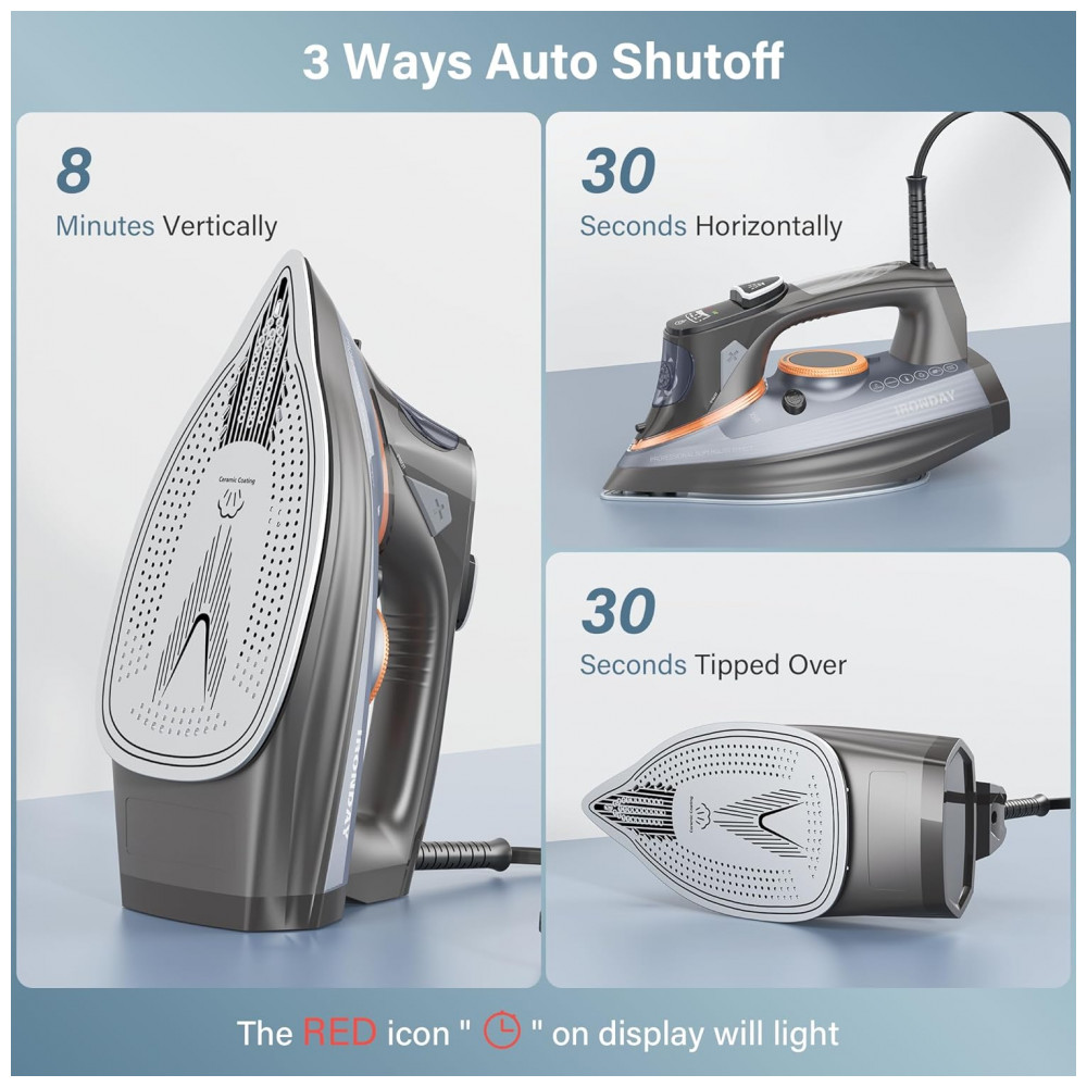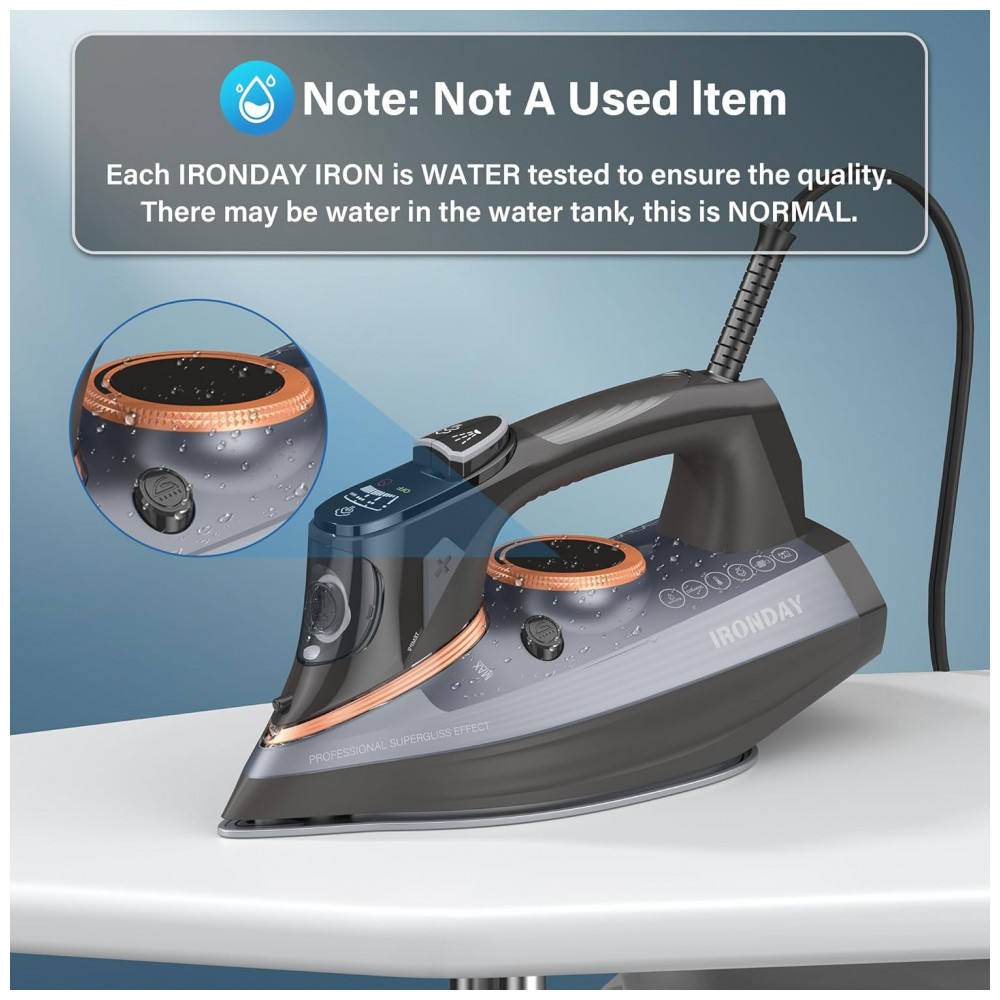 Cada ferro a vapor IRONDAY passa por rigorosos testes de qualidade com água antes de sair da fábrica, garantindo a qualidade e segurança do produto. A tela LCD amigável ao usuário oferece 4 configurações pré-definidas para passar roupas de forma precisa. Com desligamento automático em 3 posições, reservatório de água generoso de 290ml, opções de vapor horizontal e vertical, jato de vapor potente, névoa de spray suave, este ferro é ideal para lidar com grandes volumes de roupa com eficiência.