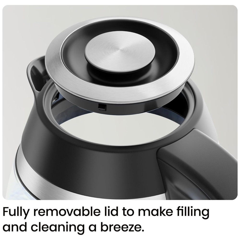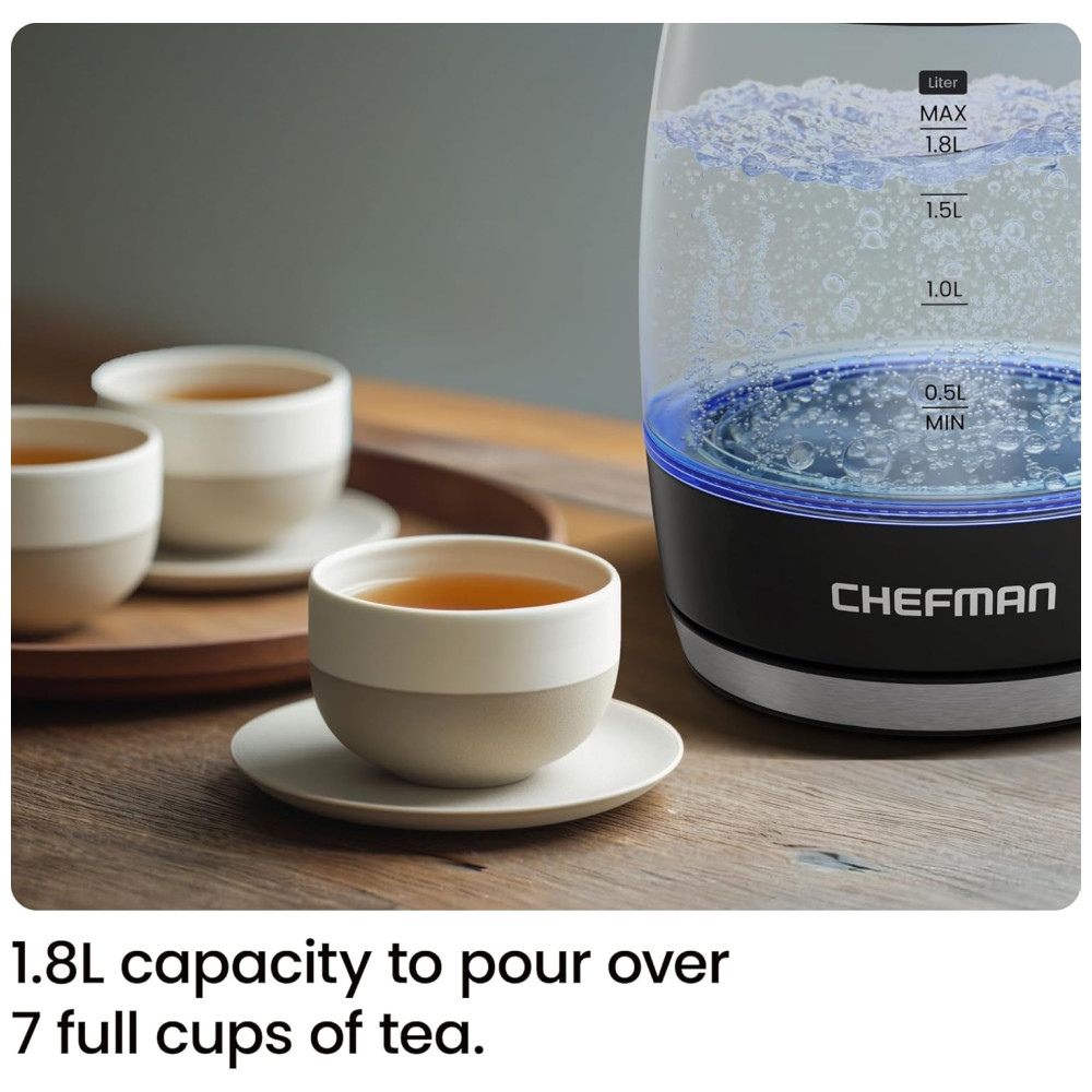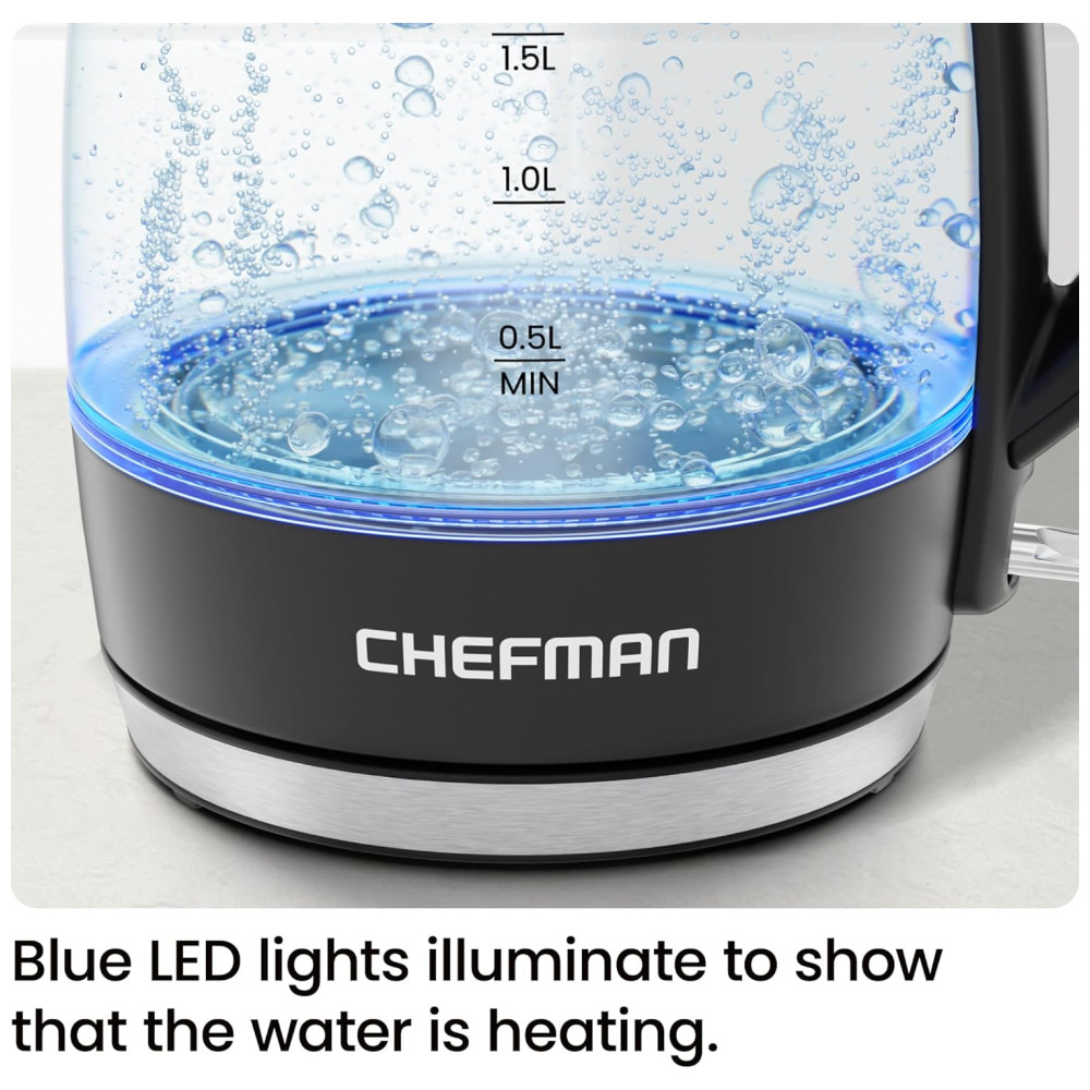 Desfrute de uma experiência de fervura rápida com esta chaleira elétrica de 1500W. Tenha água quente em apenas 3 minutos, ideal para preparar chá, café e outras bebidas quentes de forma eficiente. Garanta segurança e tranquilidade com o desligamento automático e proteção contra superaquecimento. Com design elegante e moderno em vidro borossilicato, complementado por acabamentos em aço inoxidável e luzes de LED azuis. Aproveite o conforto de servir em qualquer lugar, sem fio, com a base giratória de 360 graus. Além disso, a tampa removível, filtro de aço inoxidável e alça resistente ao toque facilitam o uso e a limpeza. Ideal para aquecer água para bebidas quentes, sopas, macarrão instantâneo e aveia. Aproveite cada momento na cozinha com a Chaleira Elétrica Chefman.