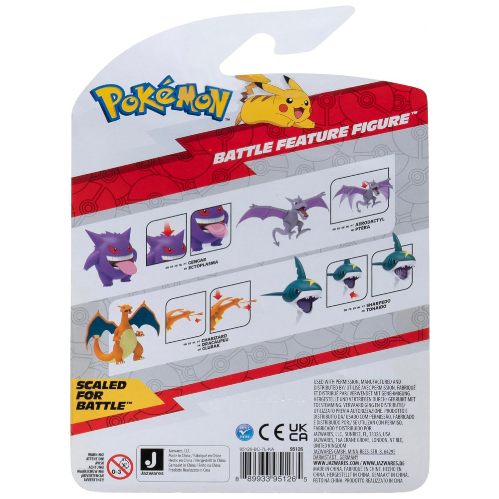 A figura é fabricada em plástico resistente, sem necessidade de baterias, indicada para crianças a partir de 4 anos e para colecionadores que buscam compor cenários com outros personagens da linha Battle Feature. Trata-se de um produto oficial licenciado da marca Pokémon, produzido pela Jazwares sob o código de modelo 95126.