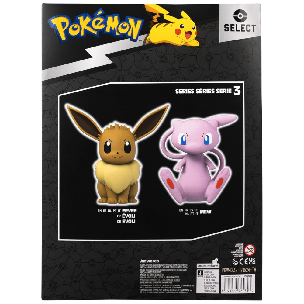 A figura Pokémon Eevee Select Jazwares é uma peça colecionável em vinil com aproximadamente 20 cm de altura, desenvolvida para exibição em prateleiras, mesas ou vitrines. O modelo representa o Pokémon Eevee em posição estática, com escultura em corpo inteiro e base estável adequada para superfícies planas.