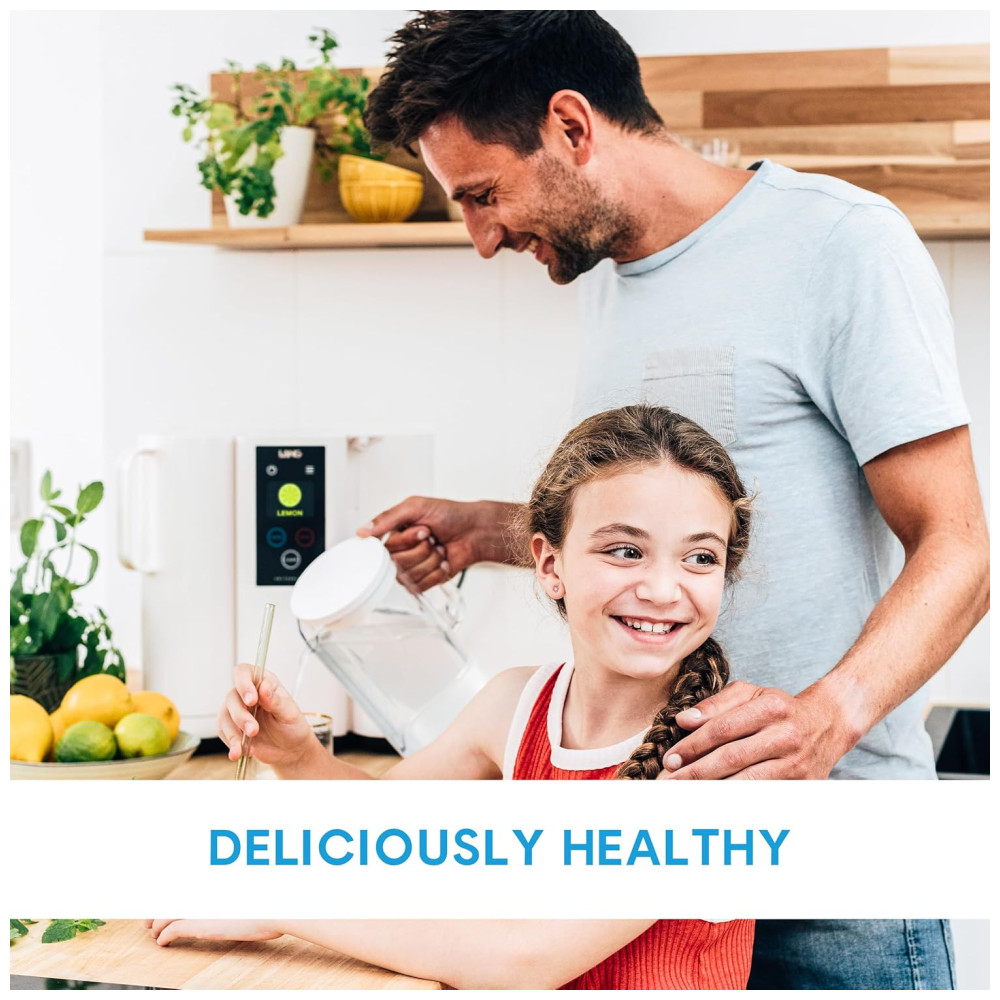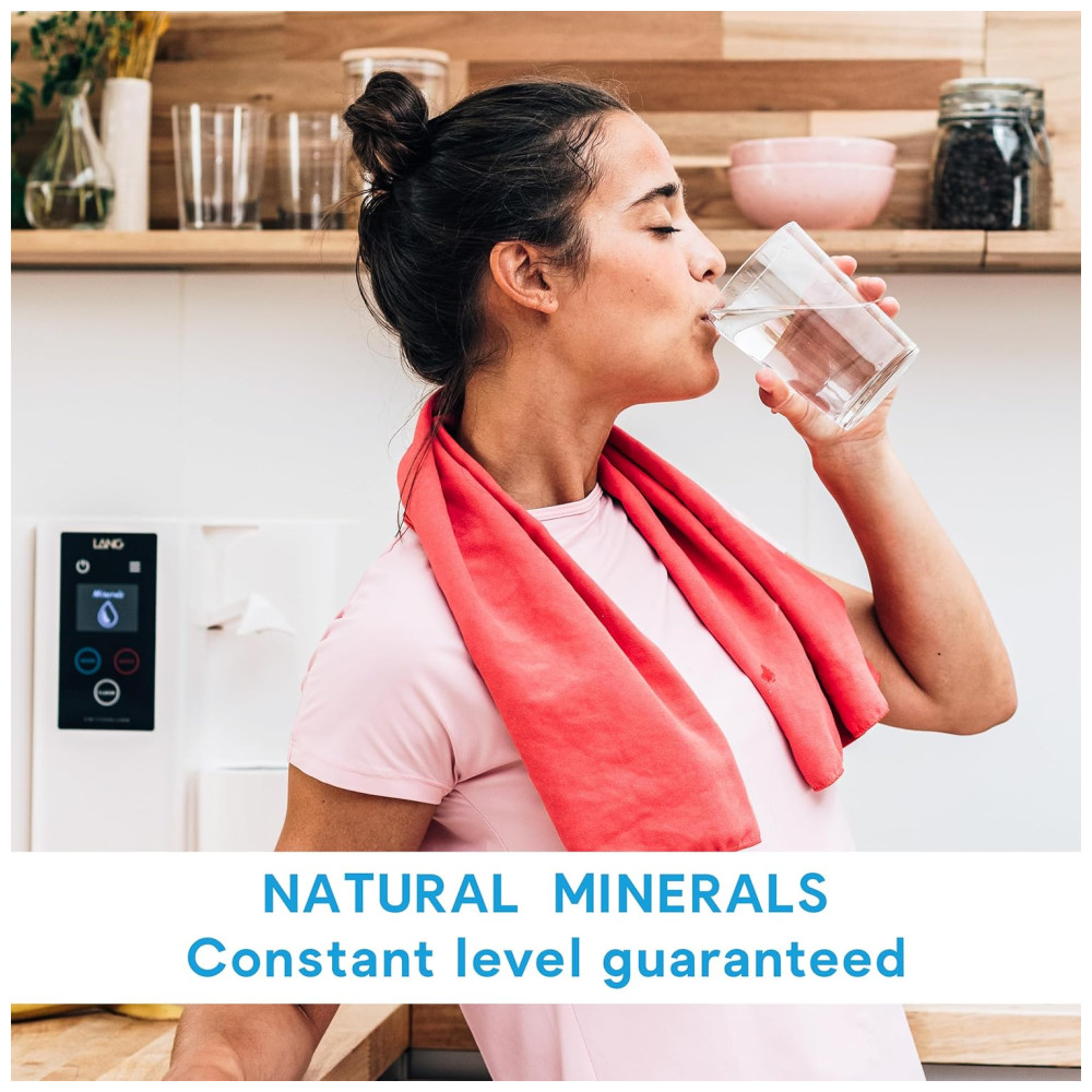 Após a purificação, o sistema aplica remineralização com minerais líquidos naturais, sem sódio e livres de contaminantes, produzidos na Suíça. A mineralização repõe magnésio, potássio e bicarbonato na água por meio de dosagens controladas e instantâneas, promovendo sabor puro e constante em cada porção. O kit acompanha sachês de sabor natural limão à base de extrato de fruta, que podem ser adicionados à água sem necessidade de preparo adicional.