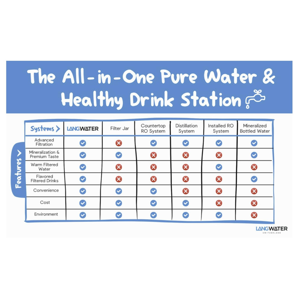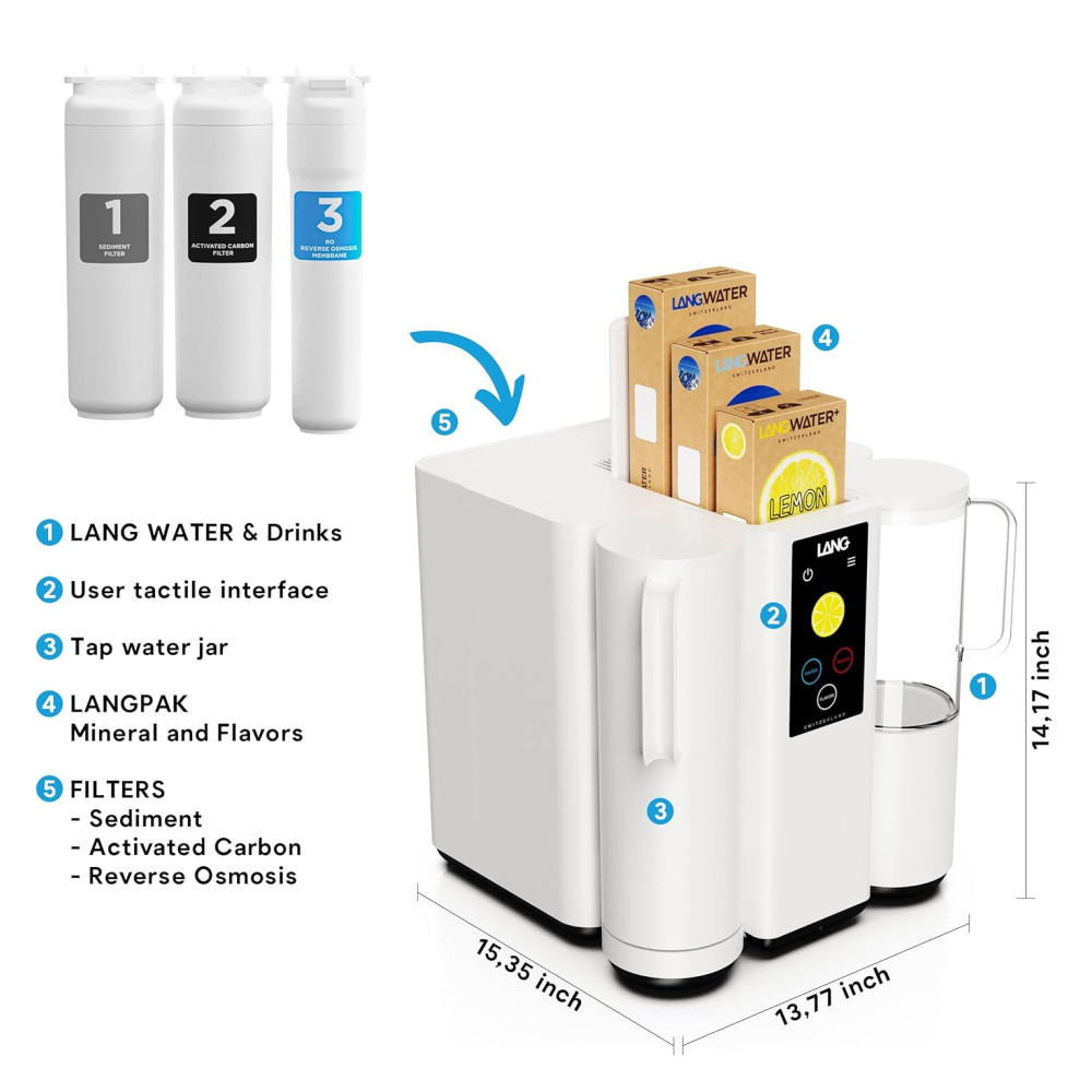 O sistema de filtração LANGWATER The Well é projetado para uso em bancada, sem necessidade de instalação hidráulica. O equipamento realiza purificação em três etapas: filtro de sedimentos (1 mícron), filtro de carvão ativado e membrana de osmose reversa, removendo até 99% de impurezas como cloro, microplásticos, metais pesados (chumbo, cadmio, arsênio), PFAS, hormônios, resíduos de medicamentos e partículas radioativas. Inclui filtro UV para proteção contra recontaminação bacteriana após o processo de filtragem.
