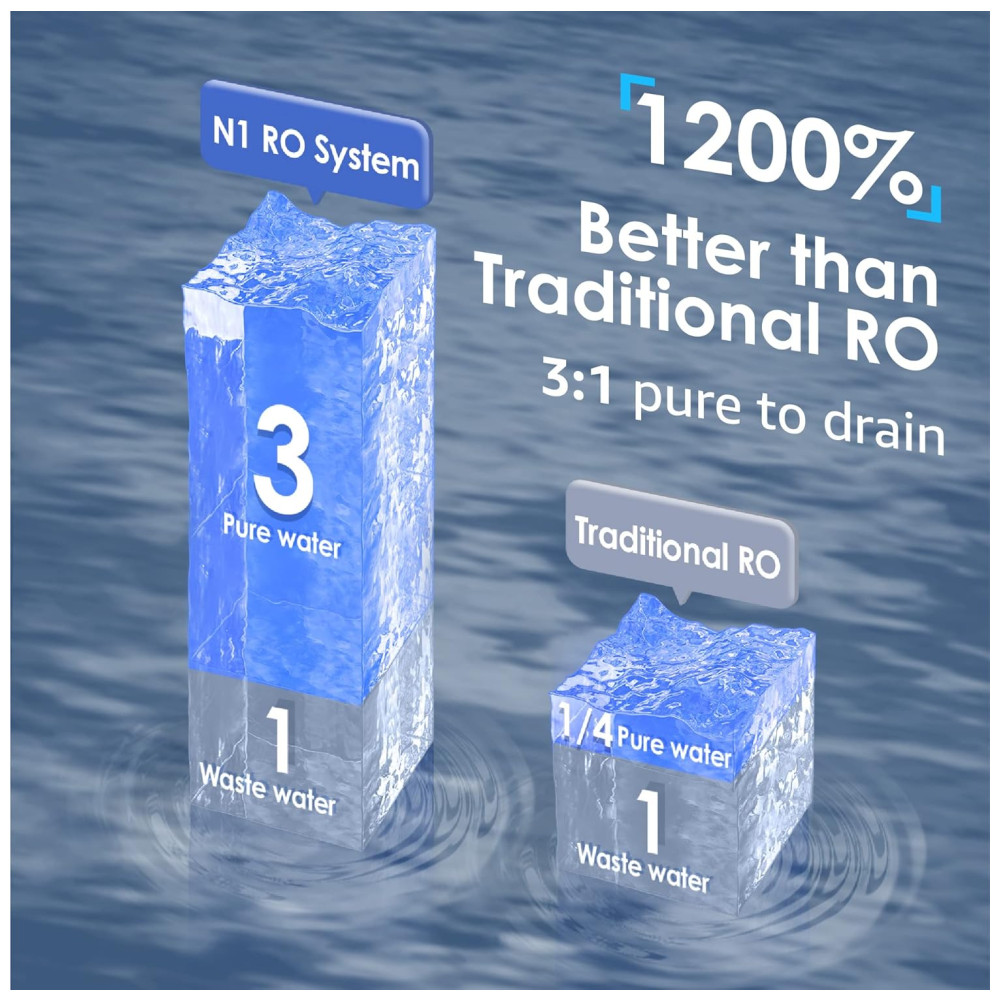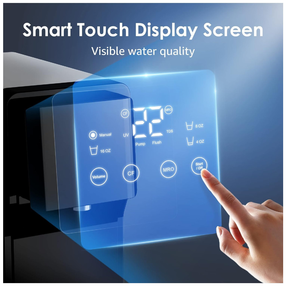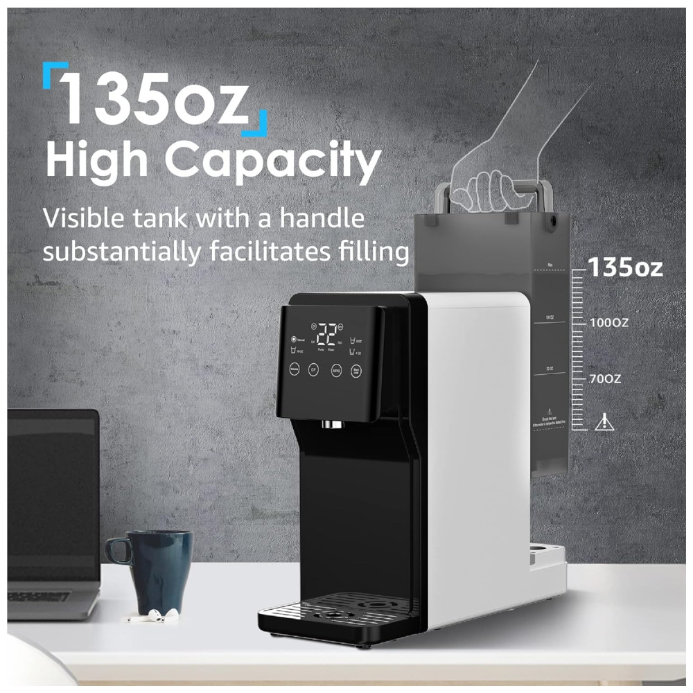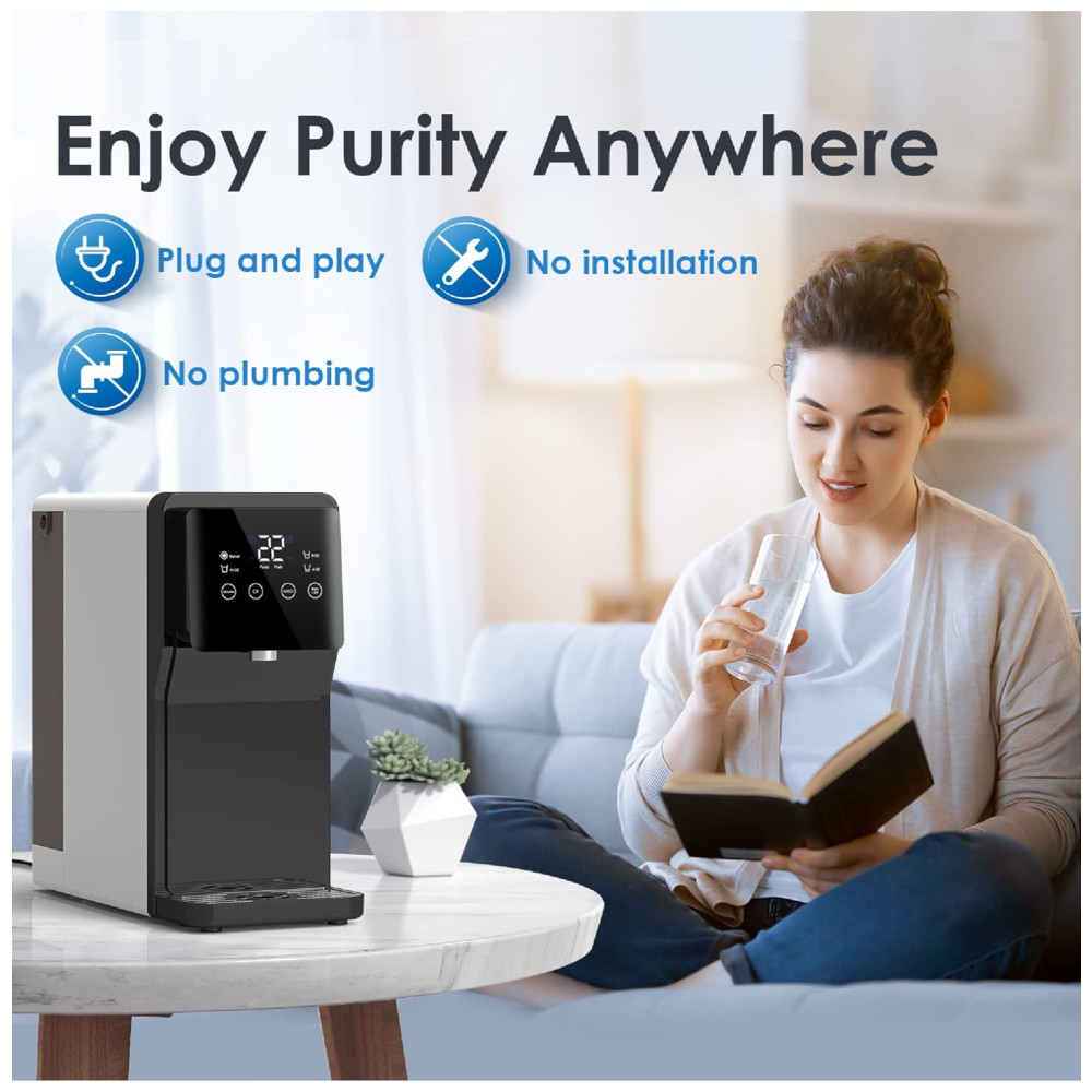 Nossa osmose reversa de bancada N1 é a escolha perfeita para quem busca água pura e fresca em qualquer lugar, sem a necessidade de instalação ou perfuração. Com uma tomada elétrica, você pode ter água pura em qualquer lugar, do quarto ao escritório. O sistema de filtragem de água de bancada possui uma tela inteligente que exibe o nível de TDS de sólidos totalmente dissolvidos, indicador de vida útil do filtro, configurações de volume, alertas de falta de água e um modo de descarga automática. É importante ressaltar que o sistema não deve ser utilizado com água de poço ou fonte com alto TDS 500.