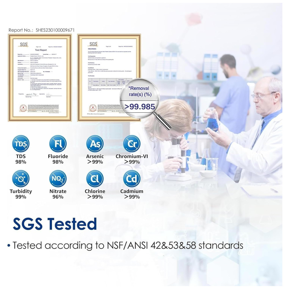 O sistema de osmose reversa de bancada reduz o desperdício com sua impressionante taxa de drenagem de 31 e tecnologia de reciclagem de água de drenagem, para que você não desperdice muita água. Além disso, o sistema entra no modo de economia de energia quando ocioso, reduzindo o consumo de energia e economizando eletricidade.