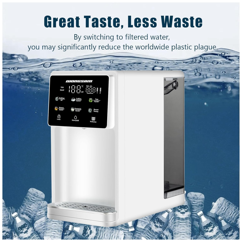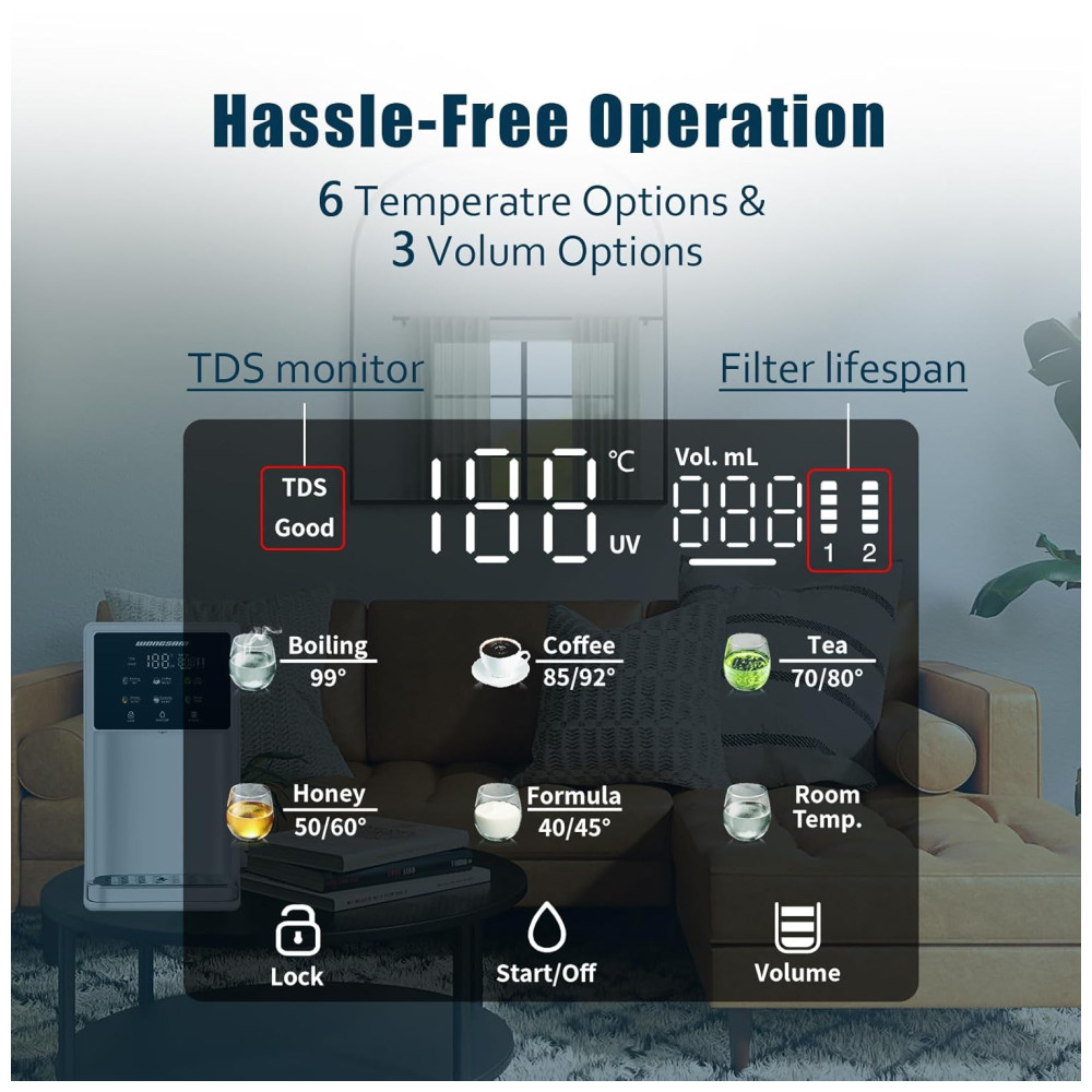 Com uma proporção de 4:1 puro para drenagem, este purificador de água de bancada atinge uma alta eficiência de água. Além disso, possui recursos inteligentes, como tecnologia Instant Hot, display LED inteligente para monitorar a vida útil do filtro e opções de temperatura e volume na tela sensível ao toque. Este sistema também está equipado com proteção de segurança anti seco e função de evitar o reinício da fervura.