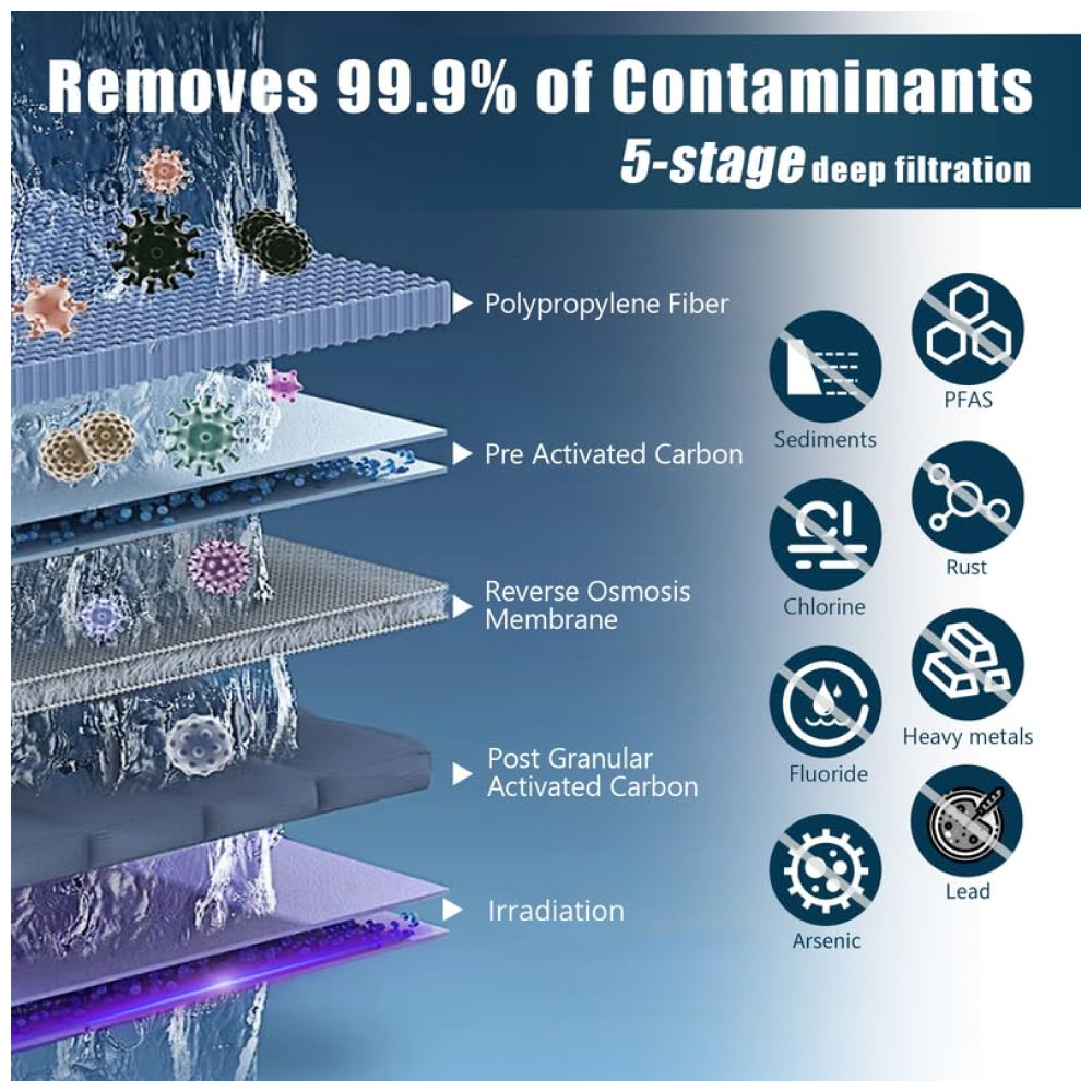 Este sistema de purificação de água de bancada é fácil de configurar e manter, não exigindo instalação ou encanamento. Com filtros RO e PAC com durações de até 24 e 69 meses, respectivamente, a troca é rápida e fácil em apenas 30 segundos. Com uma filtragem premium de 5 estágios, este sistema é certificado para reduzir mais de 99,9 de todos os contaminantes, incluindo sedimentos, ferrugem, PFOA PFOS, cloro, flúor, metais pesados, chumbo, arsênico e muito mais.