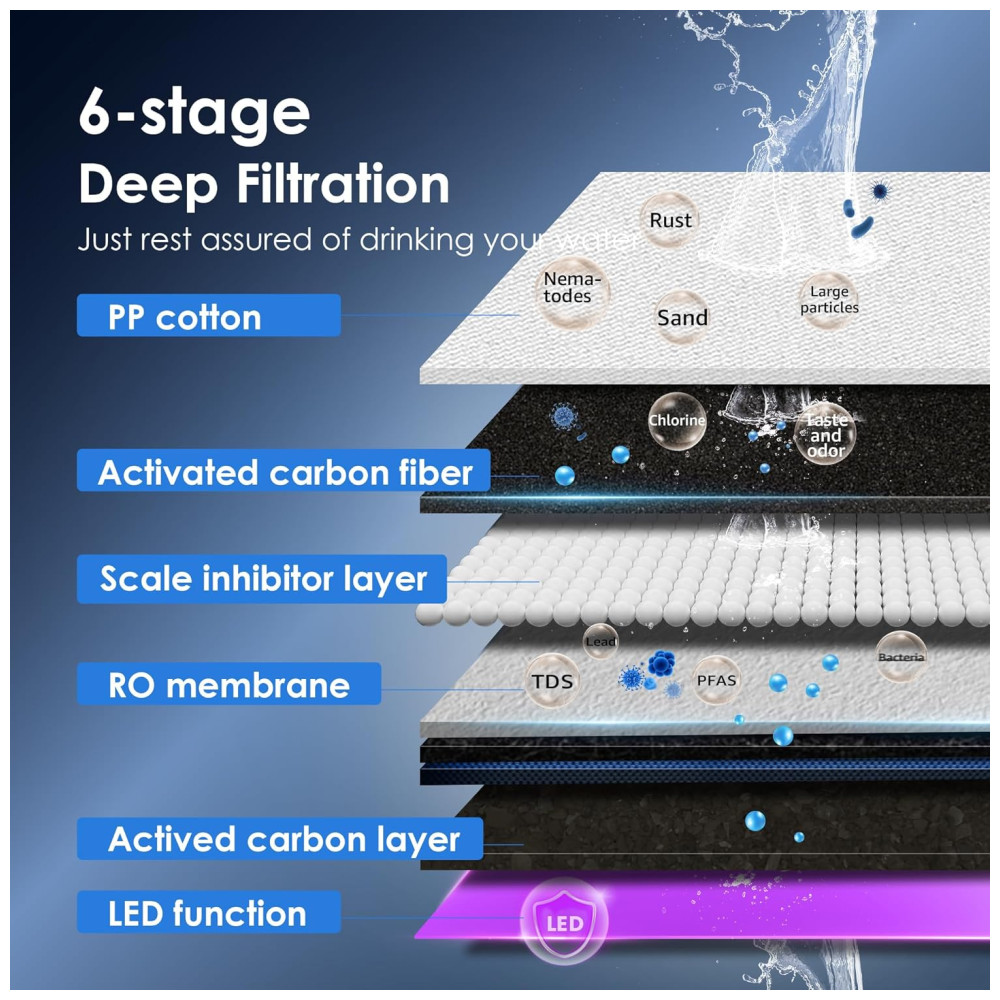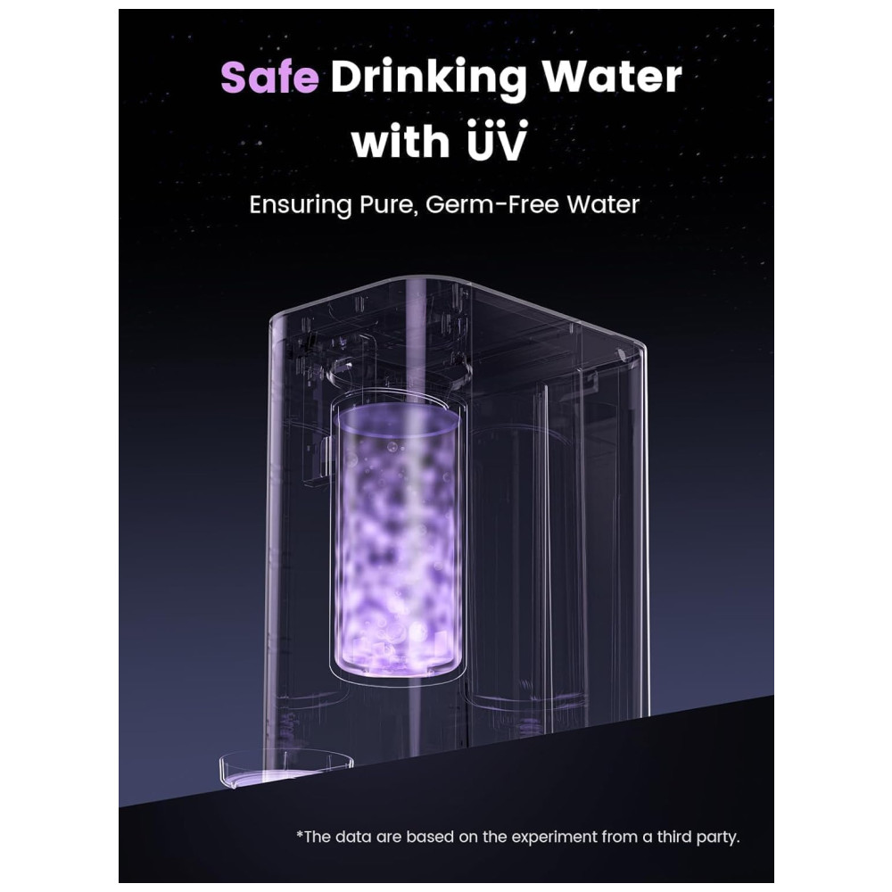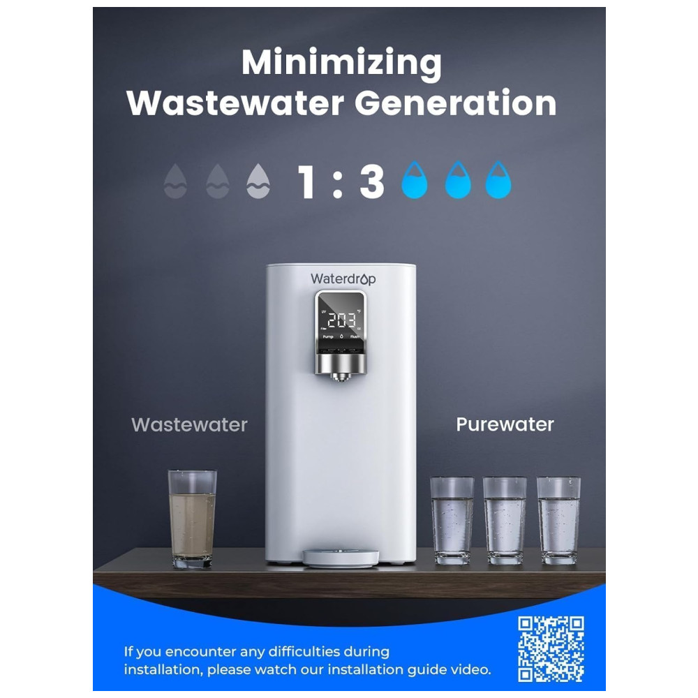 Seu filtro 3 em 1 efetivamente reduz TDS, cromo, rádio, flúor, arsênico, sal, metais pesados, nitrato, partículas, cloreto e substâncias radioativas. O sistema possui um painel de operação fácil de usar e uma tela inteligente que exibe a temperatura, volume de água, filtragem de água, estados de lavagem, qualidade da água e também vem com um modo platô. Além disso, este sistema RO de bancada está equipado com um lembrete de falta de água e queima a seco e uma trava para crianças para garantir a segurança de você e de sua família.