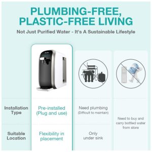 O conjunto completo de filtros twistandseal de troca rápida vem incluído, tornando a substituição do filtro fácil e sem complicações. Este sistema de purificação de água SimPure é altamente eficiente, com uma taxa de utilização de água do sistema RO de 4:1 puro para drenar, economizando água em até 1.500. Além disso, o sistema é fácil de usar, pois não requer instalação e pode ser movido para qualquer lugar com fonte de alimentação disponível.