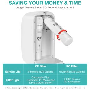 Este sistema é perfeito para uso doméstico, na cozinha, no escritório, em acampamentos, em RVs ao ar livre, etc. A taxa de fluxo de distribuição mais rápida é de 418 GPD, fornecendo um copo de água purificada em cerca de 15 segundos.