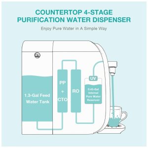 Com o sistema de purificação UV combinado com o sistema de filtragem RO 3Stages 0,0001 m, a purificação da água é levada a outro nível, eliminando efetivamente 99,99 dos microorganismos, bactérias e germes. Este sistema não usa produtos químicos e não emite subprodutos, tornando o uma opção mais saudável e completa para a esterilização da água.