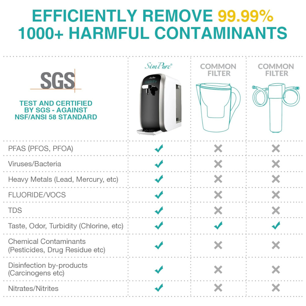 Este sistema de purificação de água SimPure é testado e certificado pela SGS contra NSFANSI 58 e padrão EPA 537, garantindo a remoção de até 1.000 contaminantes presentes na água da torneira, incluindo vírus, bactérias, produtos químicos PFASPFOAPFOS, produtos farmacêuticos, metais pesados, chumbo, arsênico, cloro, fluoreto TDS, nitratos, nitritos e outros.