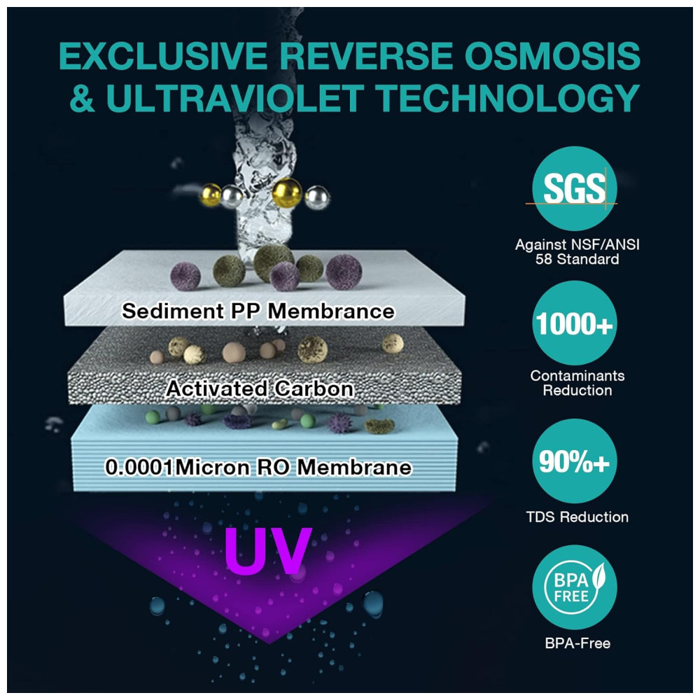 Com o sistema de purificação UV combinado com o sistema de filtragem RO 3Stages 0,0001 m, a purificação da água é levada a outro nível, eliminando efetivamente 99,99 dos microorganismos, bactérias e germes. Este sistema não usa produtos químicos e não emite subprodutos, tornando o uma opção mais saudável e completa para a esterilização da água.