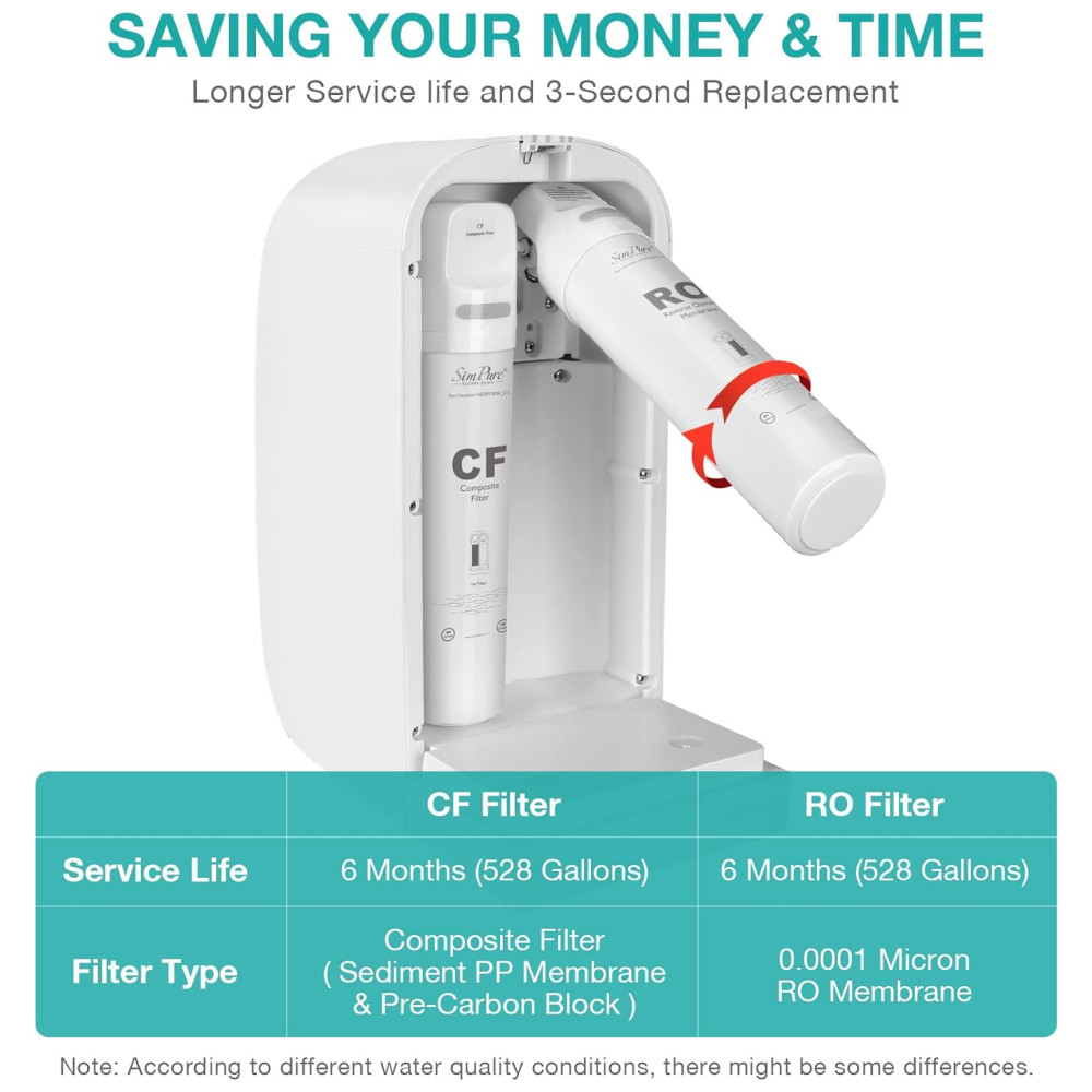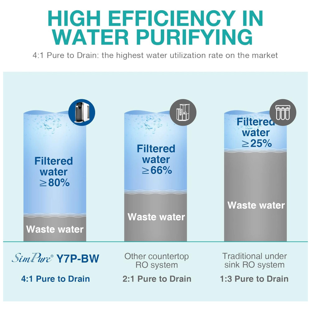 O conjunto completo de filtros twistandseal de troca rápida vem incluído, tornando a substituição do filtro fácil e sem complicações. Este sistema de purificação de água SimPure é altamente eficiente, com uma taxa de utilização de água do sistema RO de 4:1 puro para drenar, economizando água em até 1.500. Além disso, o sistema é fácil de usar, pois não requer instalação e pode ser movido para qualquer lugar com fonte de alimentação disponível.