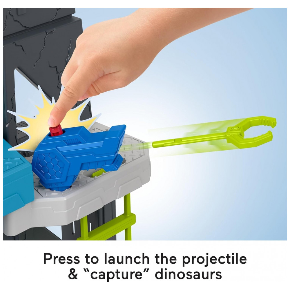 Quantidade de peças: 6 (playset, 2 dinossauros, 1 figura, 1 lançador, 1 projétil)