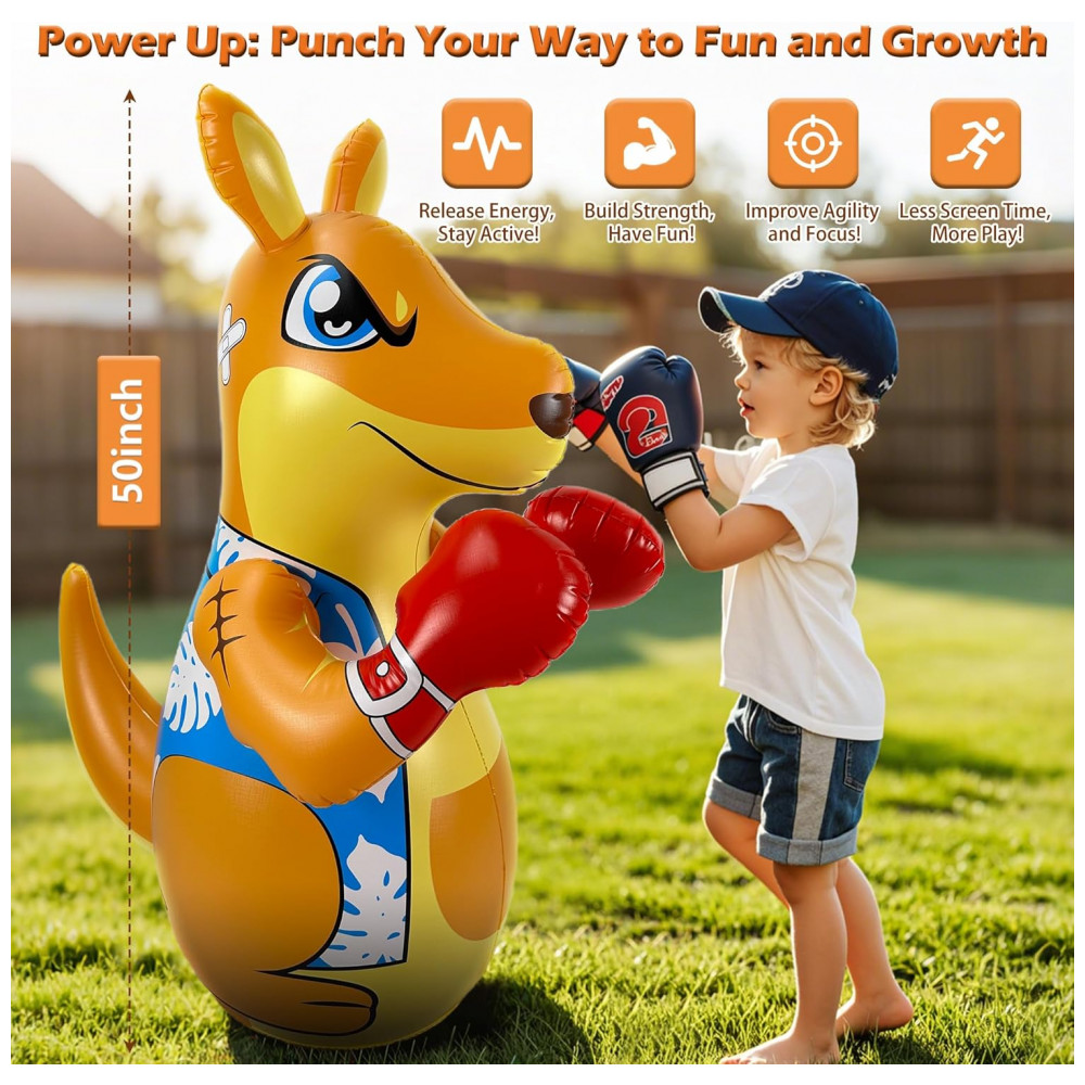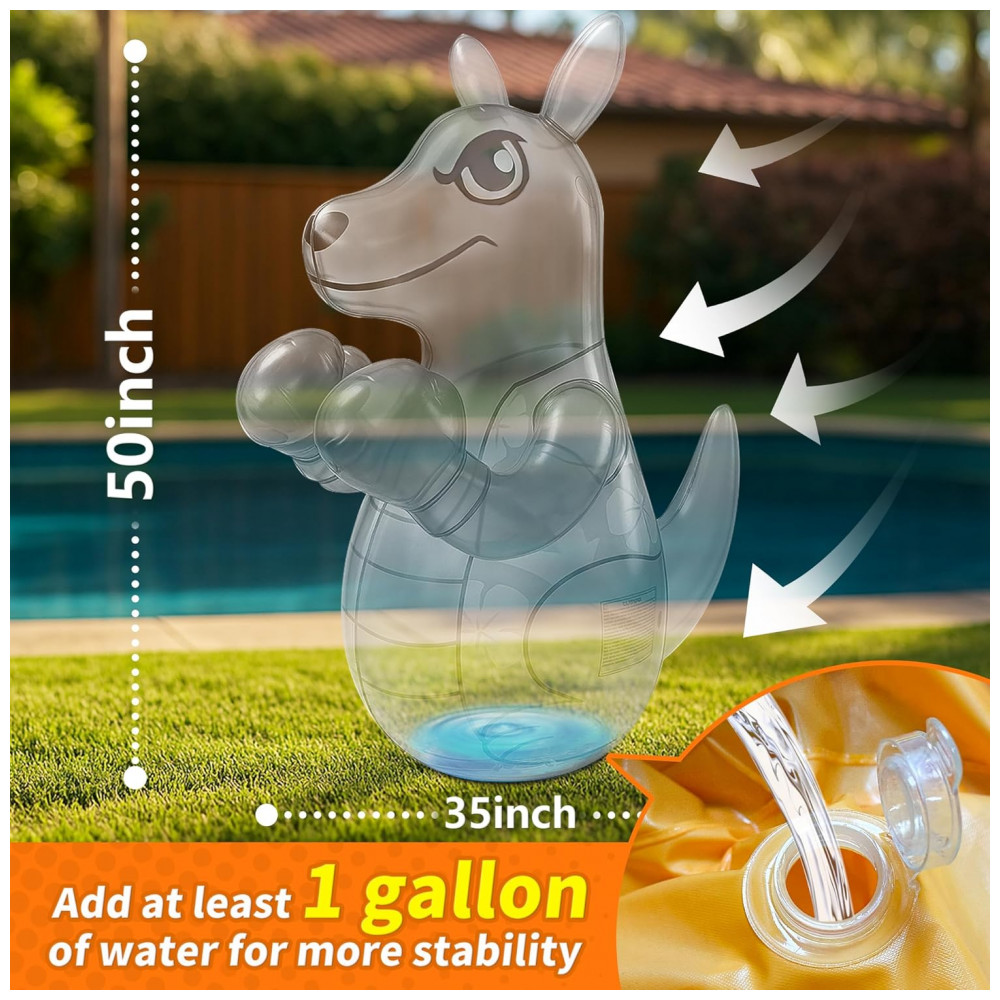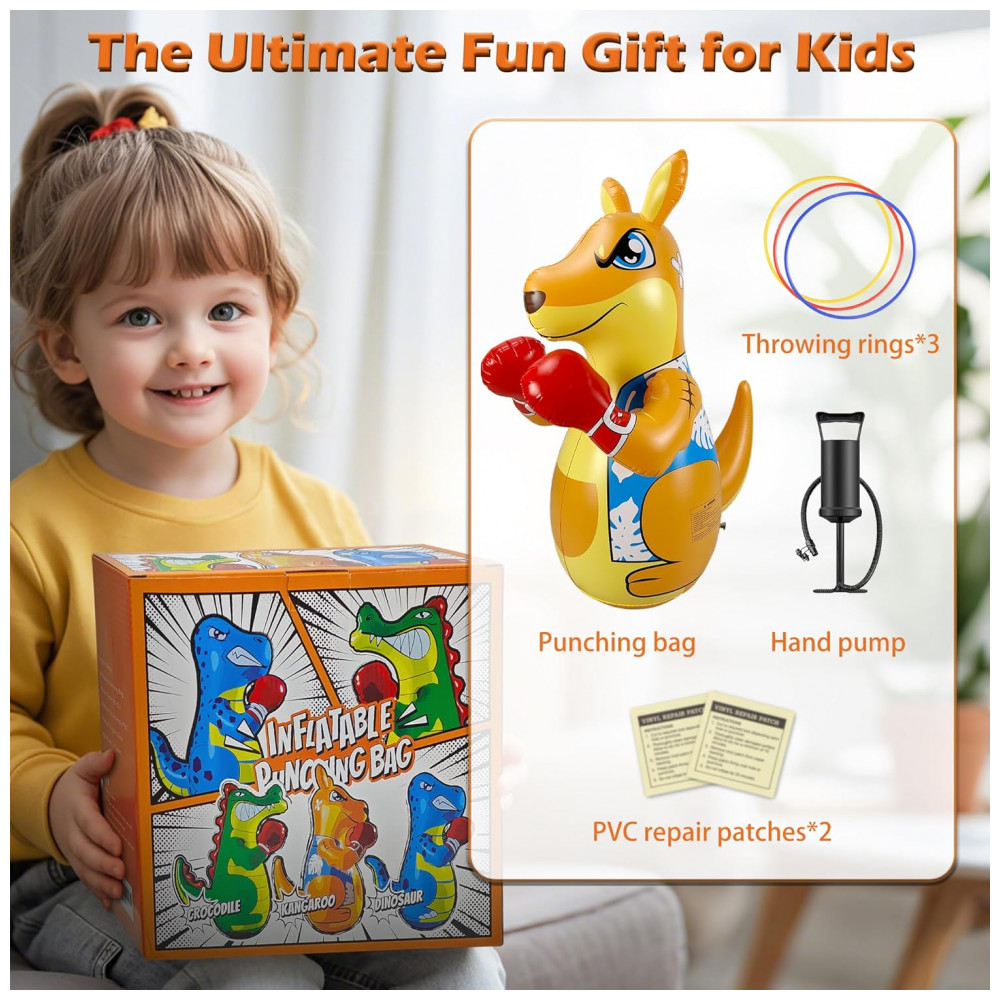 Brincadeira Ativa e Divertida para Crianças: Este saco de pancadas inflável da FloVogue, com 127 cm de altura, é o brinquedo perfeito para crianças de 3 a 8 anos que gostam de gastar energia de forma saudável. Ideal para uso interno ou externo, ele ajuda a desenvolver força, coordenação e condicionamento físico através de atividades interativas e divertidas. Modos de Jogo Duplos: As crianças podem aproveitar dois modos de brincadeira emocionantes — boxe e jogo de arremesso. Seja para praticar golpes, aprimorar a concentração e a agilidade, ou se divertir com o jogo de argolas, este saco de pancadas promove o desenvolvimento muscular e o foco de forma envolvente. Materiais Duráveis e Seguros: Fabricado em vinil grosso de alta qualidade (PVC), este saco de pancadas inflável em formato de canguru é resistente a impactos intensos, garantindo durabilidade e segurança. O material não tóxico e seguro para crianças proporciona horas de diversão sem preocupações. Design à Prova de Vazamentos e Rasgos: Construído para suportar brincadeiras vigorosas, o produto possui estrutura resistente a rasgos e vazamentos, ideal para crianças ativas que adoram brincar tanto ao ar livre quanto na piscina. Presente Perfeito para Crianças: Seja para aniversário, Natal ou outra ocasião especial, este brinquedo interativo é a escolha ideal para proporcionar momentos de entretenimento e estimular a prática de atividades físicas desde cedo.