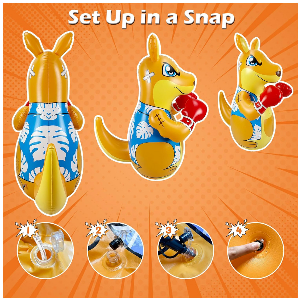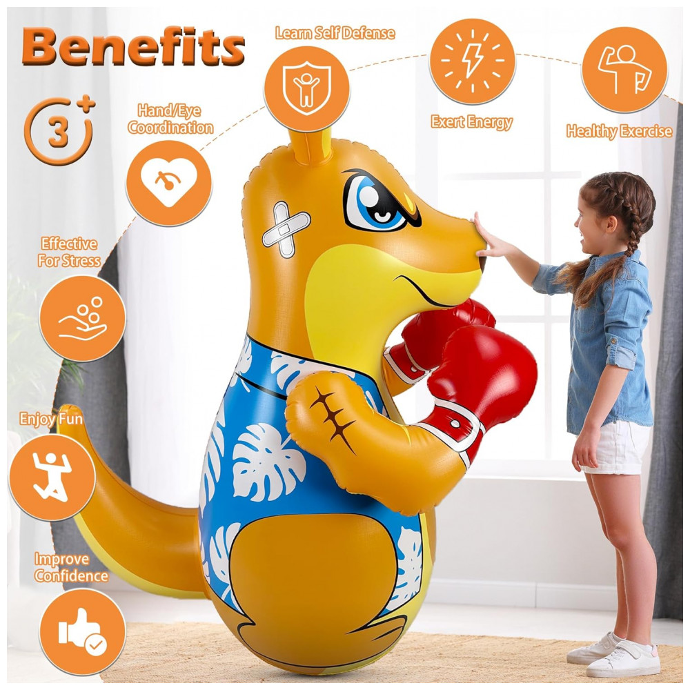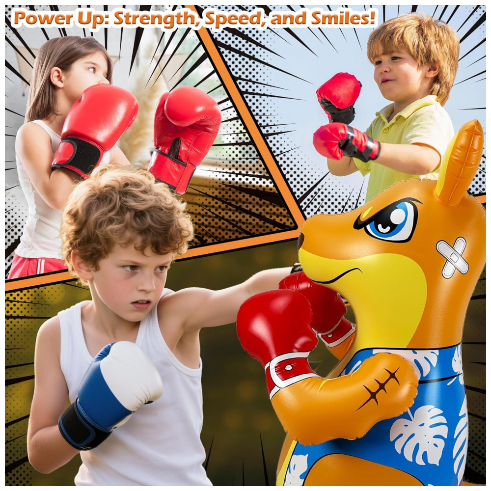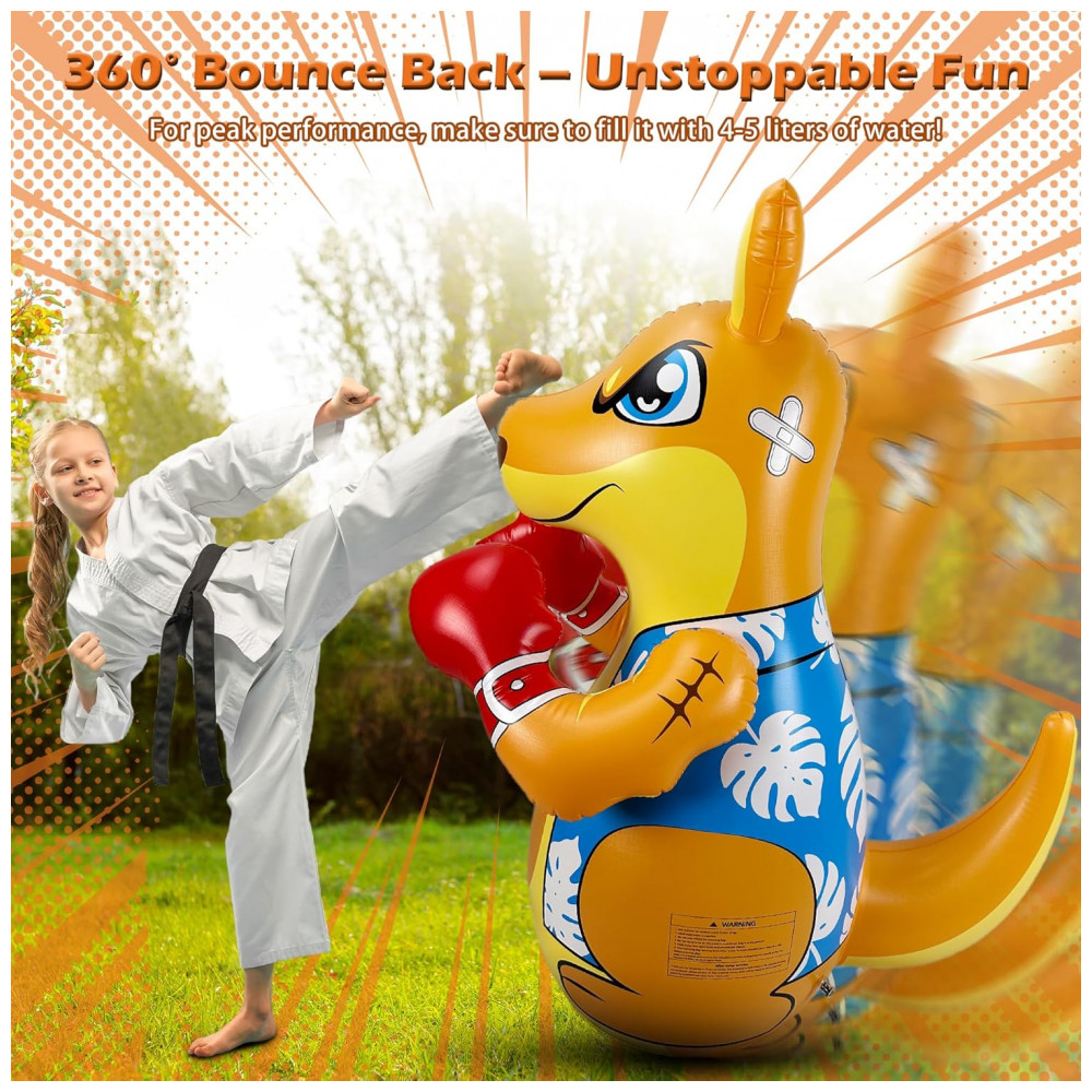 Brincadeira Ativa e Divertida para Crianças: Este saco de pancadas inflável da FloVogue, com 127 cm de altura, é o brinquedo perfeito para crianças de 3 a 8 anos que gostam de gastar energia de forma saudável. Ideal para uso interno ou externo, ele ajuda a desenvolver força, coordenação e condicionamento físico através de atividades interativas e divertidas. Modos de Jogo Duplos: As crianças podem aproveitar dois modos de brincadeira emocionantes — boxe e jogo de arremesso. Seja para praticar golpes, aprimorar a concentração e a agilidade, ou se divertir com o jogo de argolas, este saco de pancadas promove o desenvolvimento muscular e o foco de forma envolvente. Materiais Duráveis e Seguros: Fabricado em vinil grosso de alta qualidade (PVC), este saco de pancadas inflável em formato de canguru é resistente a impactos intensos, garantindo durabilidade e segurança. O material não tóxico e seguro para crianças proporciona horas de diversão sem preocupações. Design à Prova de Vazamentos e Rasgos: Construído para suportar brincadeiras vigorosas, o produto possui estrutura resistente a rasgos e vazamentos, ideal para crianças ativas que adoram brincar tanto ao ar livre quanto na piscina. Presente Perfeito para Crianças: Seja para aniversário, Natal ou outra ocasião especial, este brinquedo interativo é a escolha ideal para proporcionar momentos de entretenimento e estimular a prática de atividades físicas desde cedo.