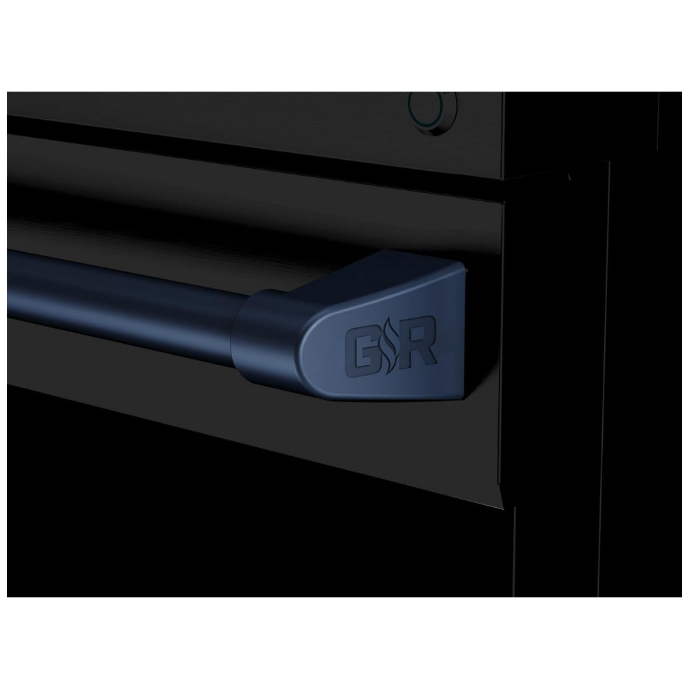 O fogão a gás GLP profissional Thor Kitchen Gordon Ramsay 76cm em preto com detalhes em azul marinho foi projetado para uso residencial com desempenho similar a equipamentos de cozinha profissional, combinando forno a gás com convecção e mesa com queimadores selados. O painel touch basculante permite ajustar o ângulo de visualização para facilitar o acesso às funções e melhorar a leitura das informações em diferentes posições de trabalho.