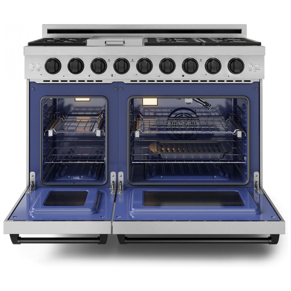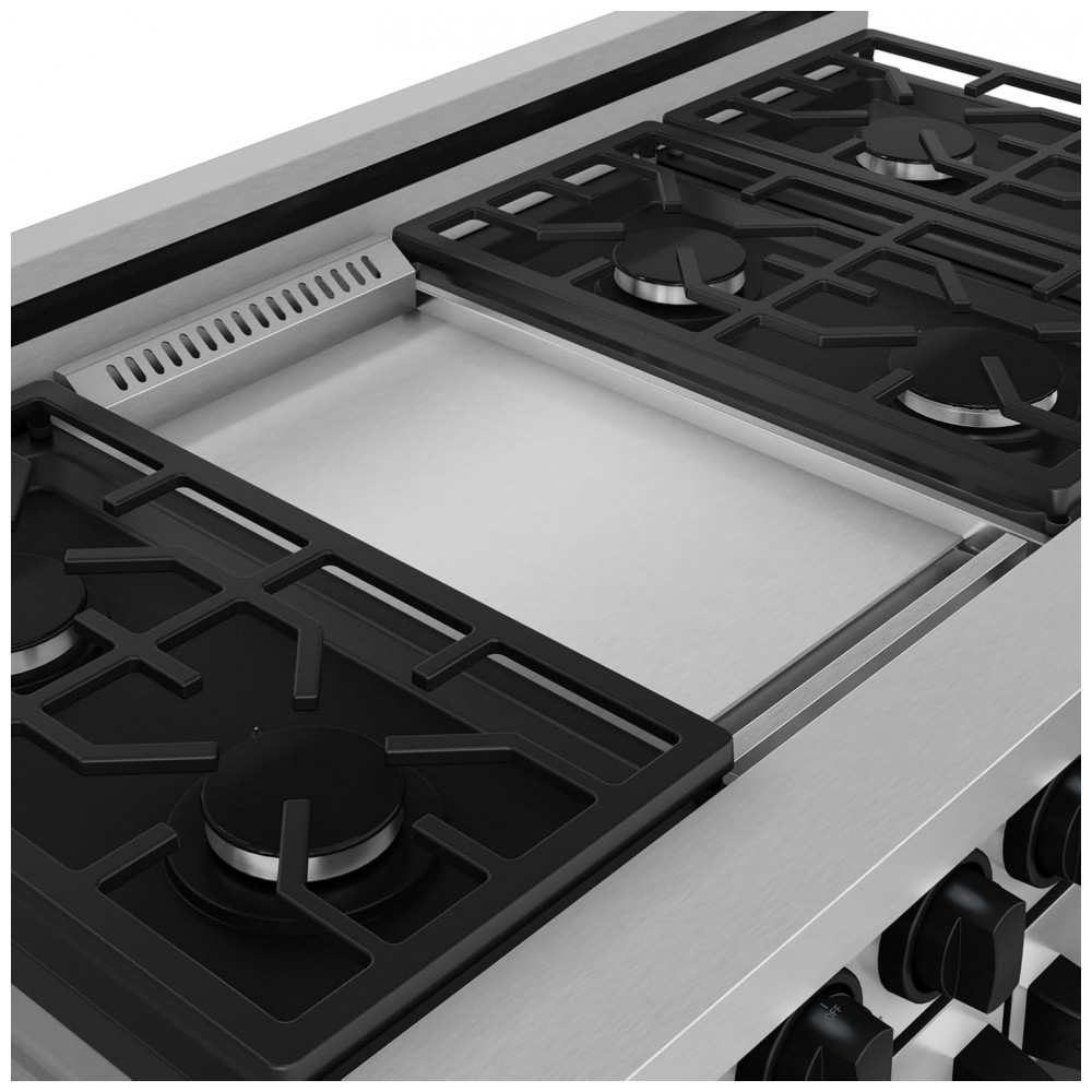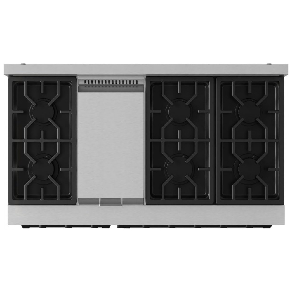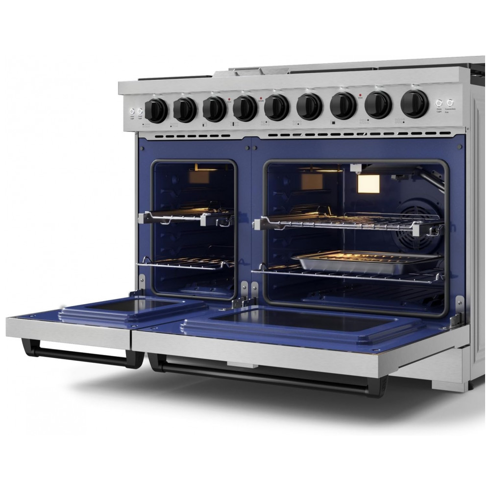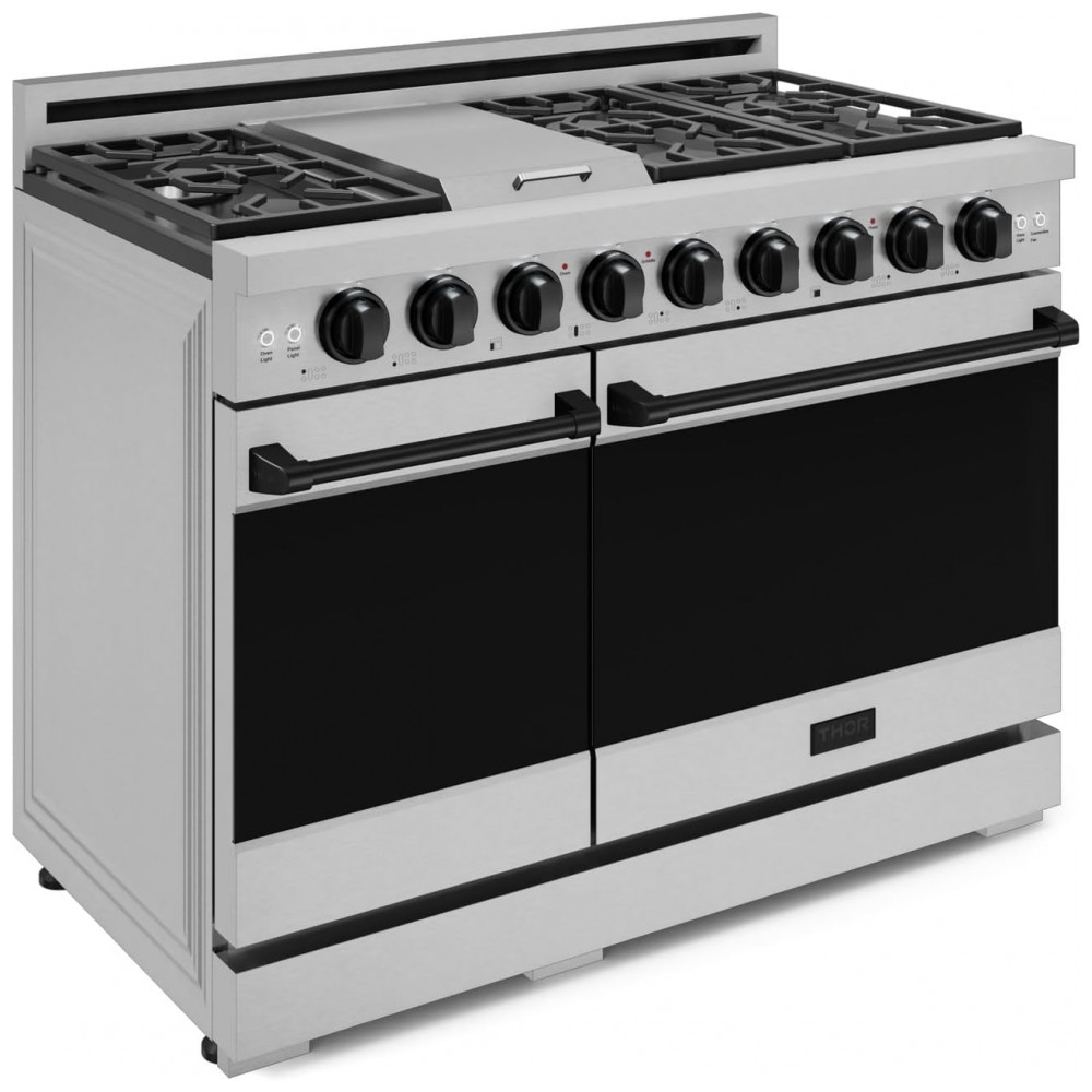 O fogão a gás Gordon Ramsay by THOR Kitchen de 48 polegadas (largura aproximada de 122 cm) é um modelo profissional freestanding para uso residencial, com acabamento em aço inoxidável e detalhes em preto. A mesa de cocção conta com sete queimadores selados de alta performance e chapa/grill integrada, com potências entre 12.000 e 18.000 BTU nos queimadores e 15.000 BTU na chapa, permitindo cocção rápida e controle preciso de calor.