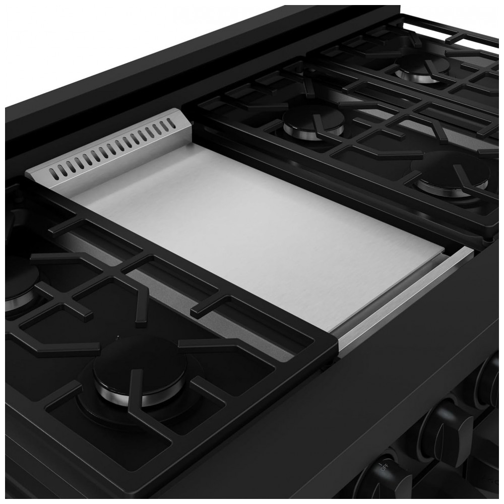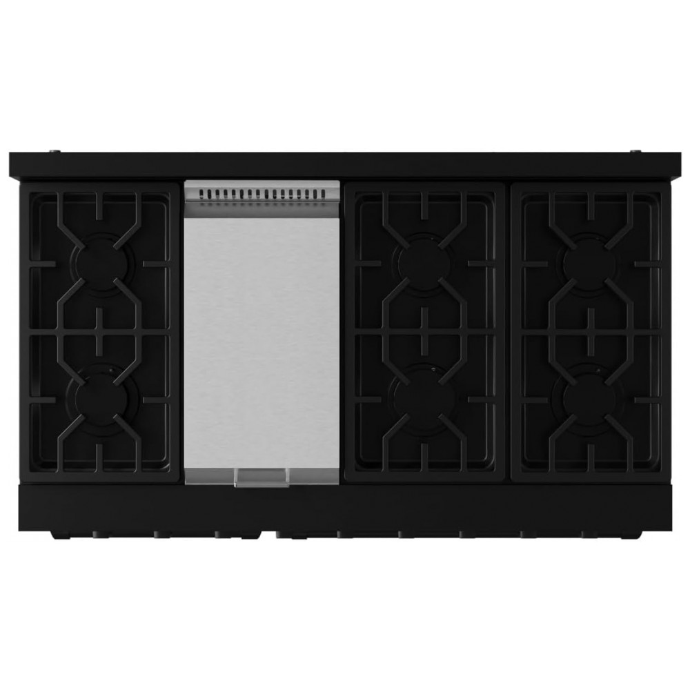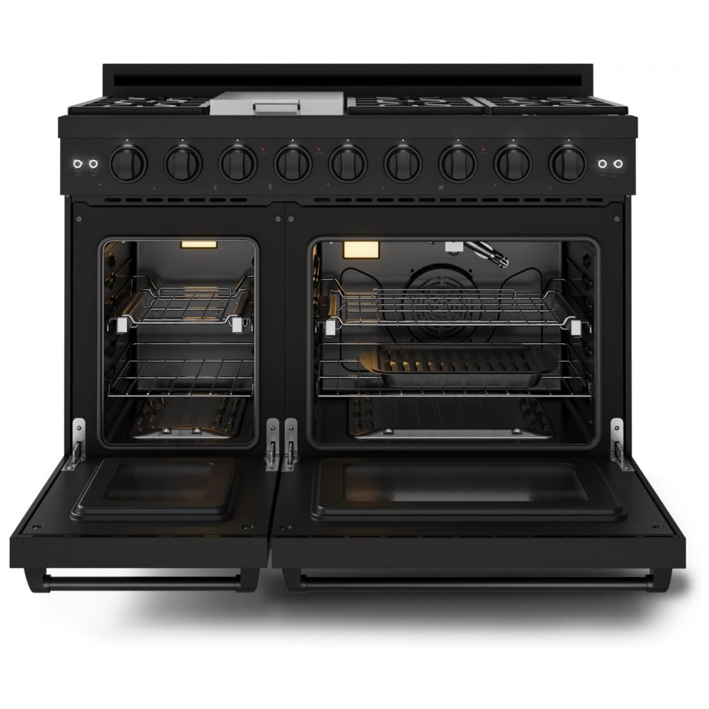 O fogão a gás profissional Gordon Ramsay by THOR Kitchen de 48″ é um modelo freestanding para uso residencial, com acabamento preto e mesa equipada com sete queimadores selados de alta performance e chapa/grill integrada. Os queimadores oferecem potência de até 18.000 BTU, com opções de chamas mais baixas para preparos delicados, enquanto a chapa de 15.000 BTU amplia a área útil para grelhar e selar alimentos diretamente sobre a superfície.