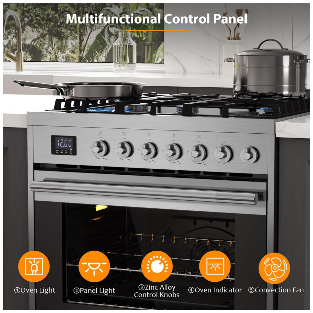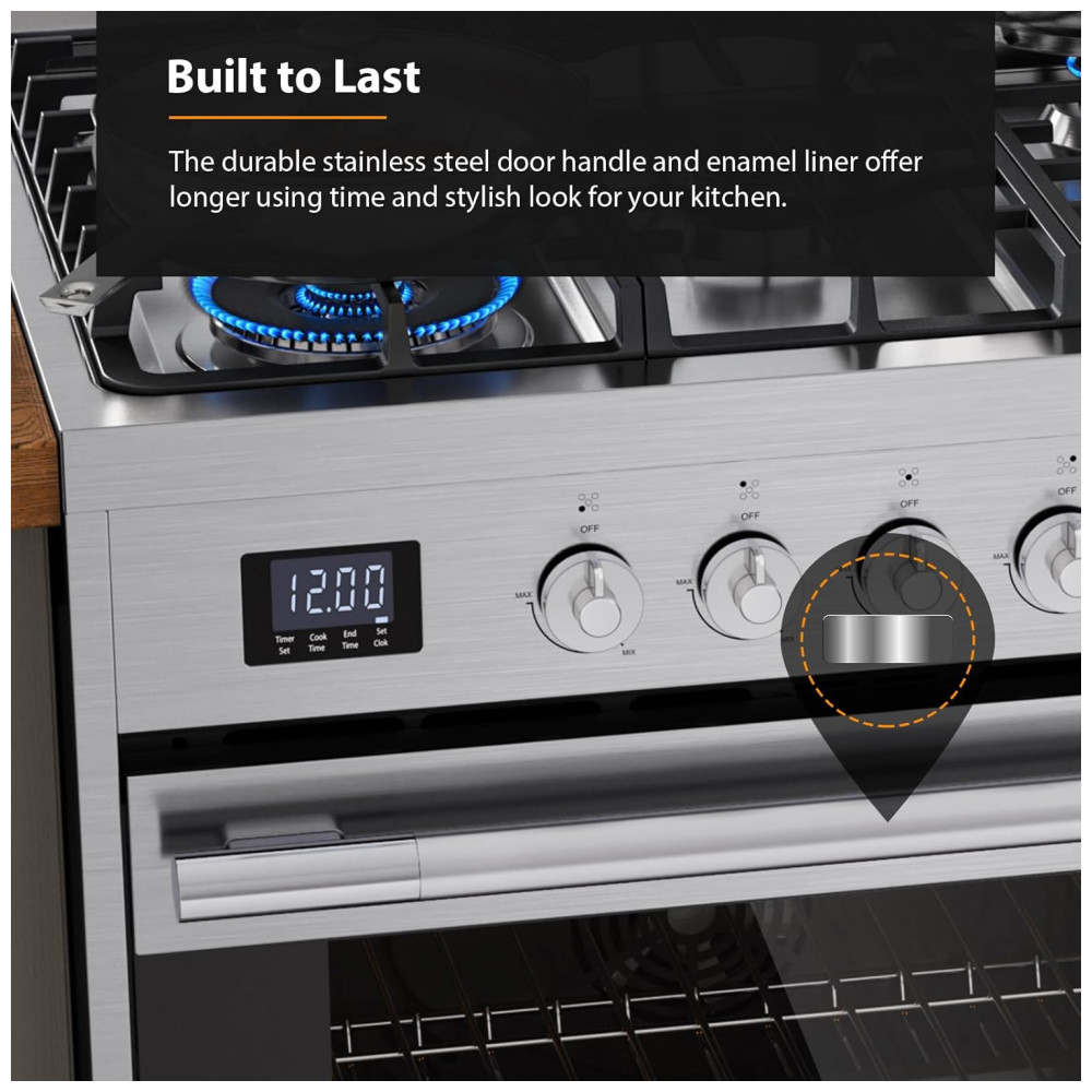 O painel frontal combina manípulos mecânicos com timer digital em display touch, permitindo programar tempo de cocção de até 11 horas e 59 minutos. O fogão é configurado para gás natural, com opção de conversão para GLP via kit de bicos e acessórios dedicados, e a estrutura slide‑in/freestanding com largura de cerca de 76cm facilita a instalação em nichos padrão de 30″.