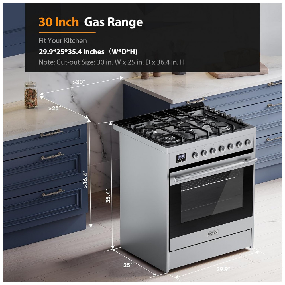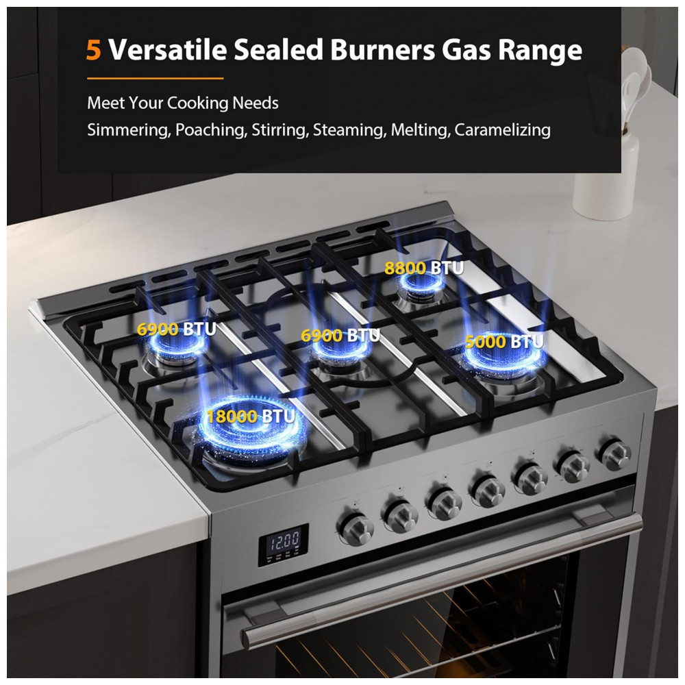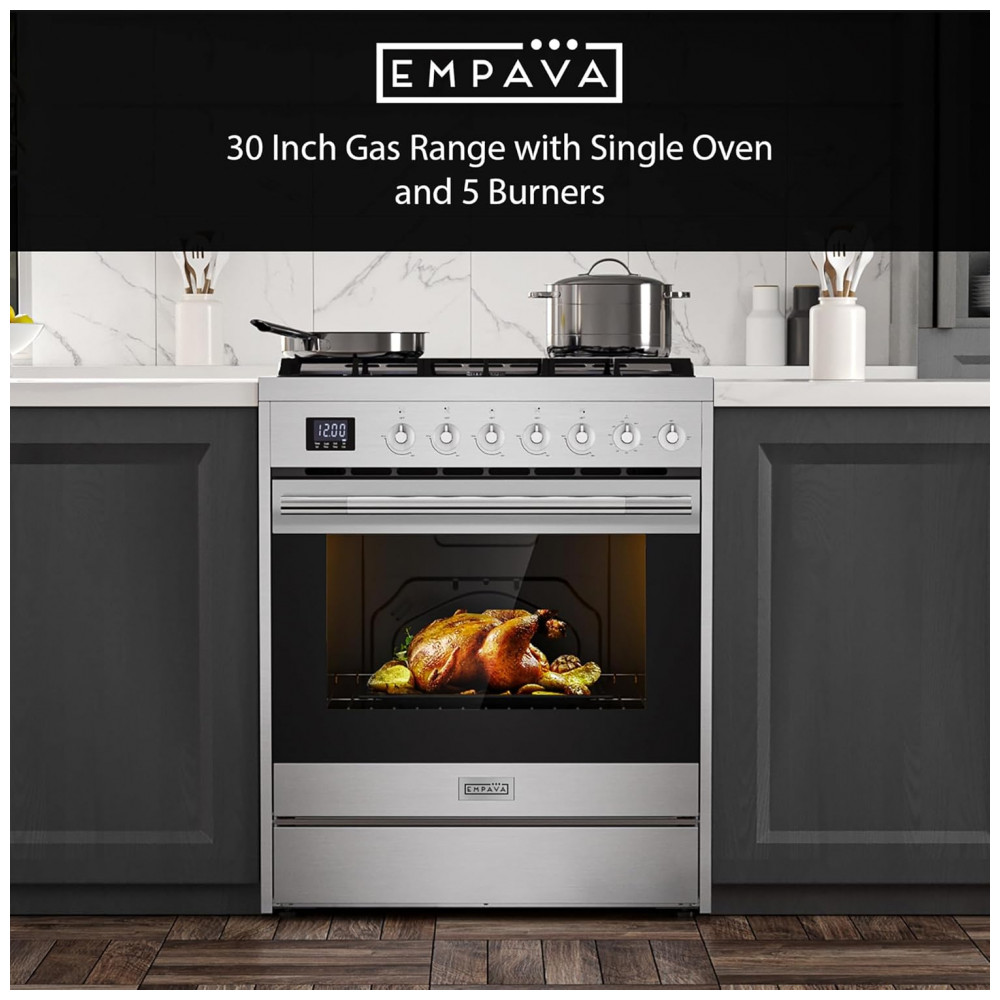 Fogão a gás profissional 76cm Empava inox convecção 5 queimadores profundos grelhas contínuas 142L 110V