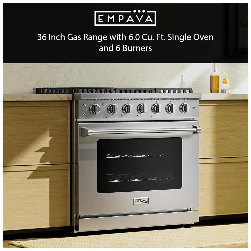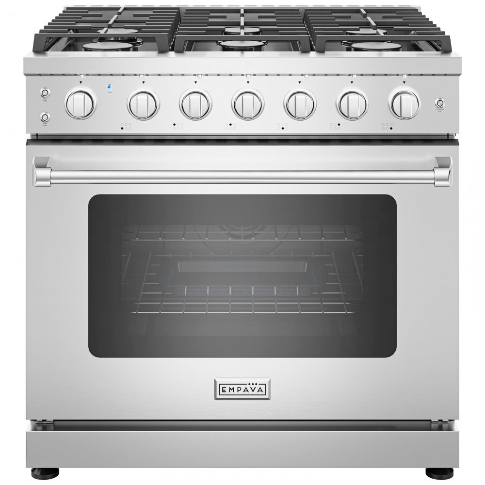 O fogão a gás profissional Empava 91cm em aço inoxidável foi projetado para uso residencial com desempenho de cozinha de alto padrão, reunindo forno a gás com convecção e grelha infravermelha e mesa com seis queimadores selados de alta potência. A construção em inox e as grades pesadas em ferro fundido formam uma superfície contínua robusta, adequada para panelas grandes e múltiplos preparos simultâneos.
