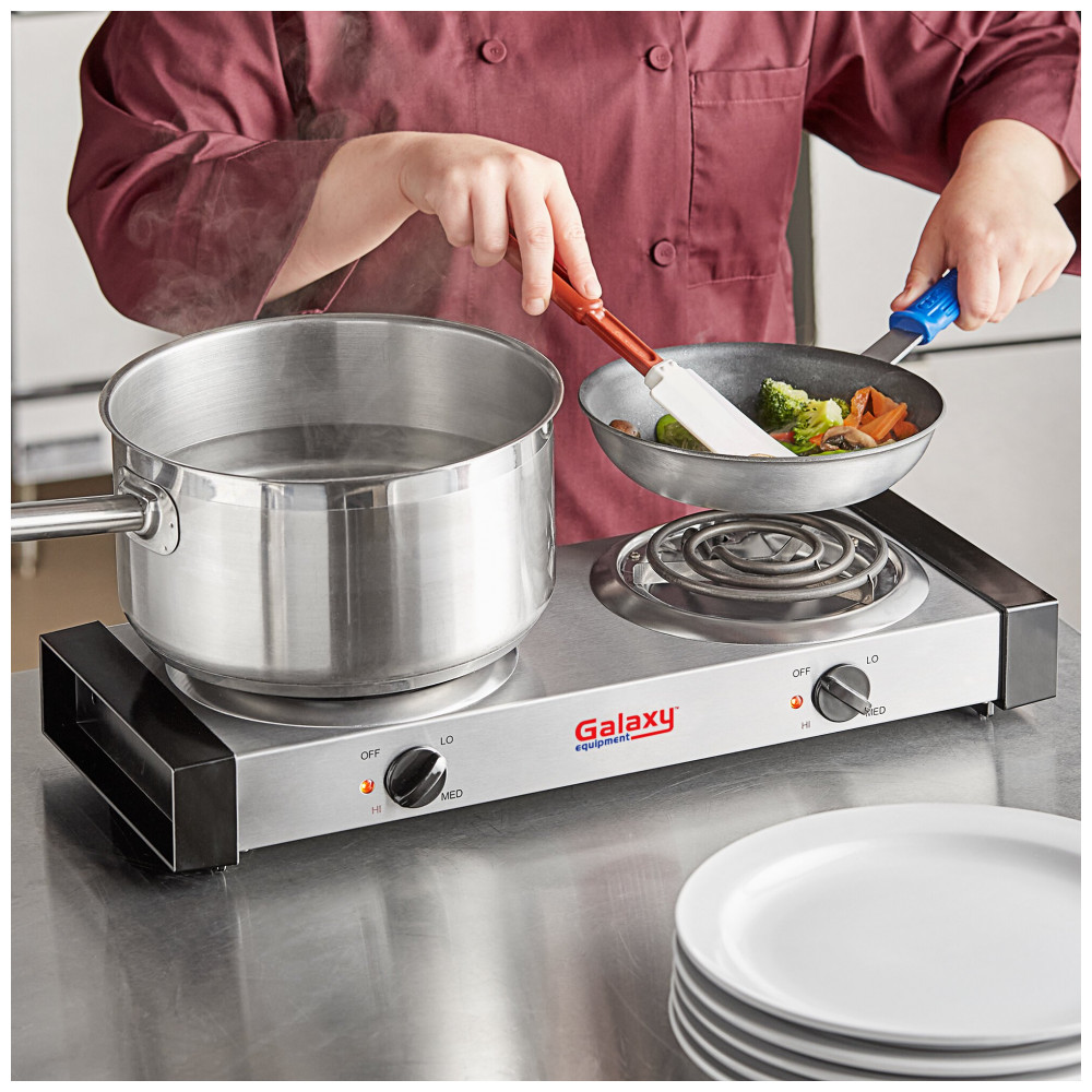 O Galaxy EB102 é um fogão elétrico de bancada com dois queimadores de bobina, projetado para eventos catering, buffets e demonstrações de cozimento. Com potência total de 1500 W em elementos de aquecimento duplos, permite preparar refeições como frituras em panela, refogados e fervuras leves em estações compactas, sem chama aberta ou combustível.