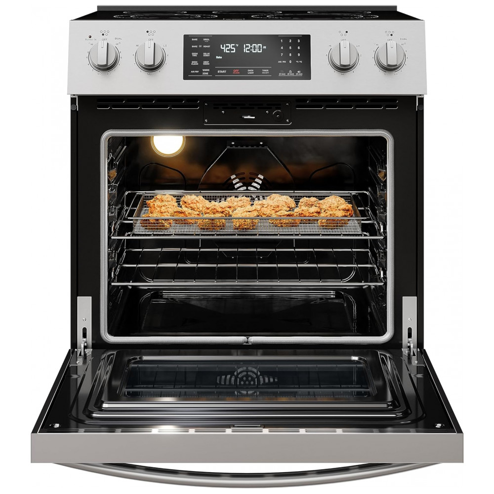 Leve sua cozinha para o próximo nível com o Fogão Kenmore Elétrico de Controle Frontal. Funcional e atraente, este fogão elétrico autônomo aprimora sua experiência de cozimento com seu design de controle frontal, 5 queimadores de cooktop, 2 grelhas de forno e luz halógena brilhante, enquanto seu acabamento em aço inoxidável elegante e moderno complementa qualquer cozinha. Os controles fáceis de usar apresentam ajustes incrementais precisos e opções avançadas de cozimento e autolimpeza com configurações múltiplas, como Início Atrasado, Manter Aquecido, Grelhar, Autolimpeza e Vapor. Apresentando 5 queimadores de cooktop, este fogão elétrico maximiza sua flexibilidade e controle de cozimento para que você possa adequar o queimador à tarefa certa e ferver água, refogar legumes e cozinhar molhos ao mesmo tempo. A Convecção Real utiliza um ventilador e um terceiro elemento de aquecimento para pré-aquecer rapidamente e cercar os alimentos com ar aquecido para um desempenho consistente e uniforme em cada grelha. A opção Air Fry com uma cesta produz ar quente circulante para criar seus alimentos fritos favoritos com uma parte externa crocante e uma parte interna macia, sem óleo ou bagunça, e os 2 poderosos elementos Turbo Boil de 3.000 watts fornecem fervura rápida, fritura e opções de selar para obter aquele sizzle perfeito em tudo, desde bifes e hambúrgueres até legumes e peixes.