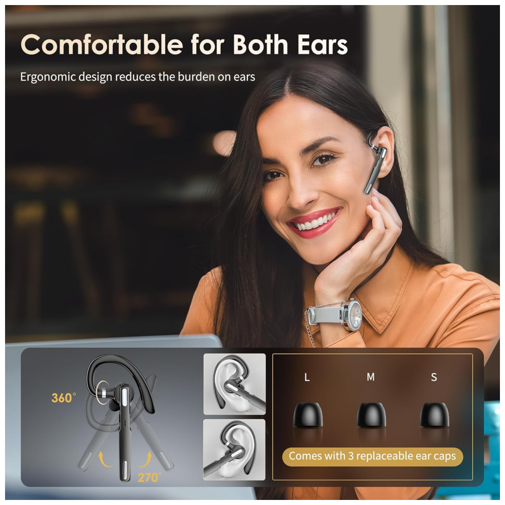 Confortável e conveniente projetado para caber em qualquer orelha, o gancho de orelha retrátil e o braço Flip boom giram e giram para um ajuste confortável. É leve e confortável o suficiente para ser por horas a fio. Os géis auriculares de conforto máximo estão disponíveis em 3 tamanhos diferentes para proporcionar um ajuste confortável e personalizado.