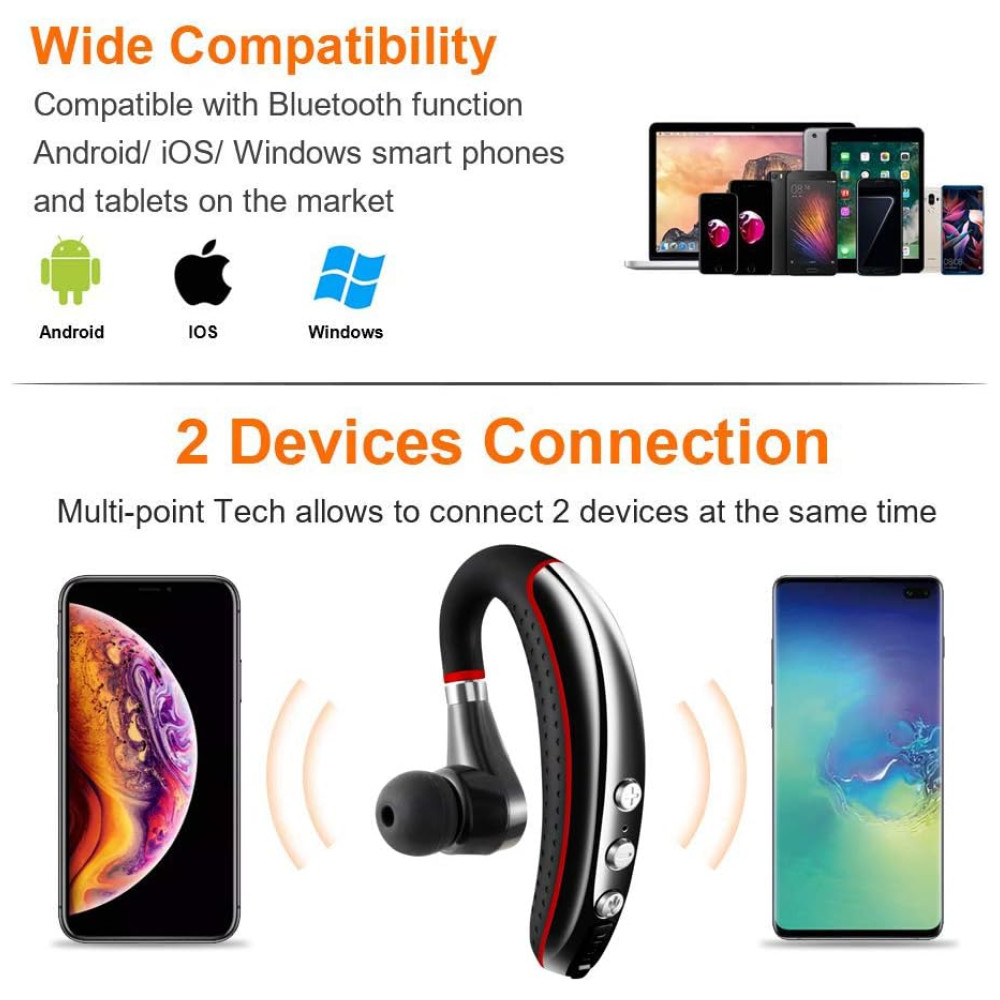 A conectividade multiusuário é suportada e o fone de ouvido sem fio pode ser com todos os smartphones, tablets e players de música. Suporte para música, vídeo, áudio, jogo. Emparelhe com 2 dispositivos Bluetooth ao mesmo tempo e você não terá que se preocupar em ter problemas com 2 telefones.
