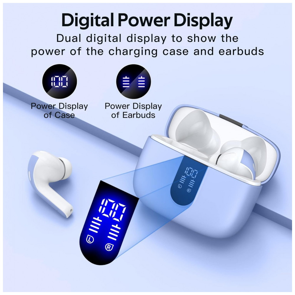 Exibição de energia de LED e reprodução de 60H A exibição de energia de LED digital dupla fora do estojo mostra o nível de energia do estojo de carregamento e dos fones de ouvido. Ao carregar o estojo, a luz do LED começará a piscar de 1 a 100. Quando você colocar os fones de ouvido no estojo, os fones de ouvido começarão a ser carregados. O estojo de carregamento com capacidade de bateria de 470mAh pode fornecer 6 vezes o carregamento completo para ambos os fones de ouvido, cada fone de ouvido pode durar 5H com carregamento único. Assim, você pode desfrutar de 60 horas de música no total, usando um por vez.